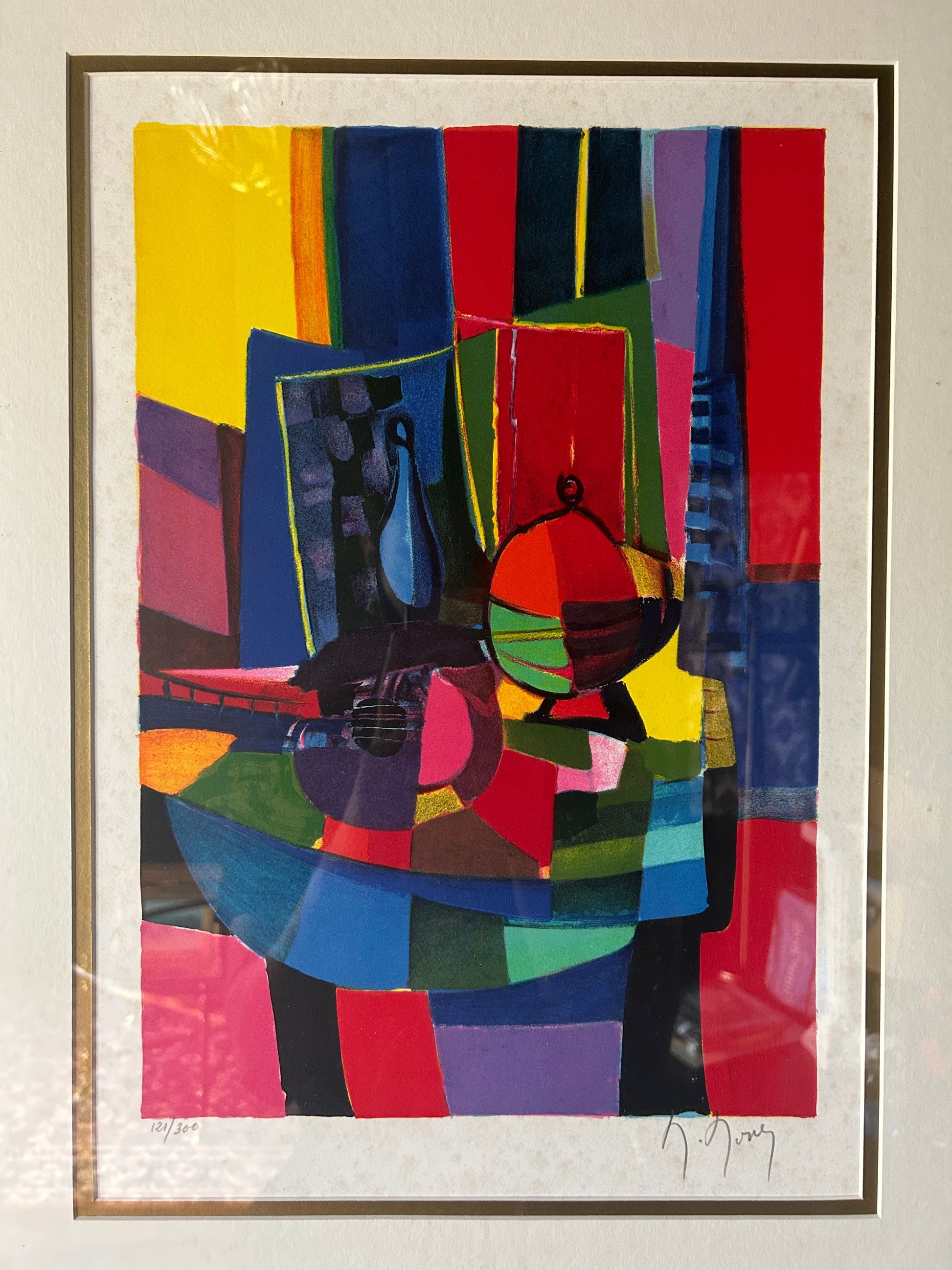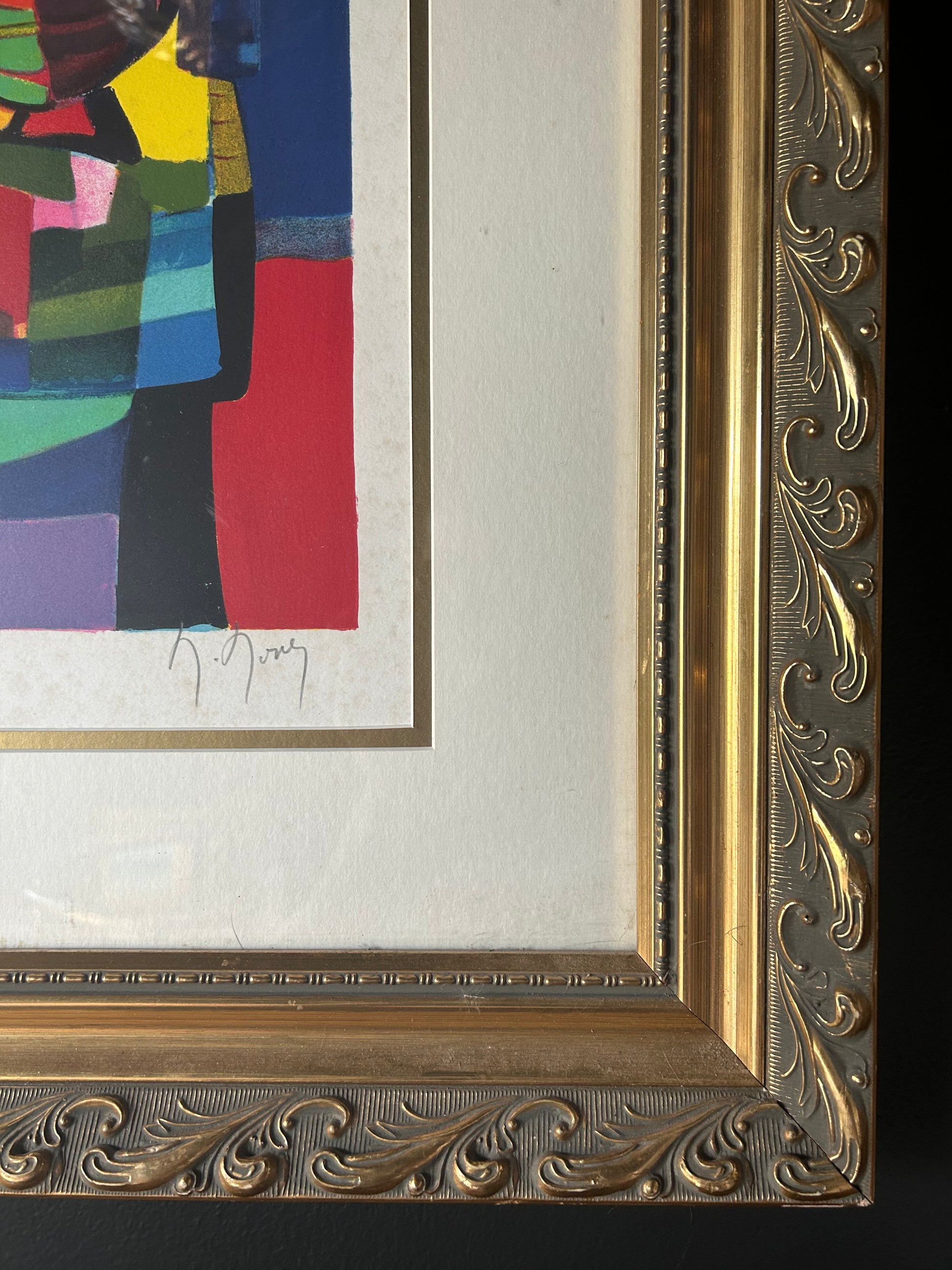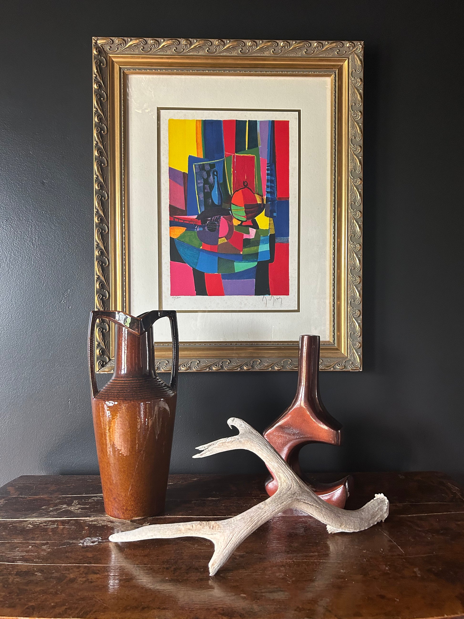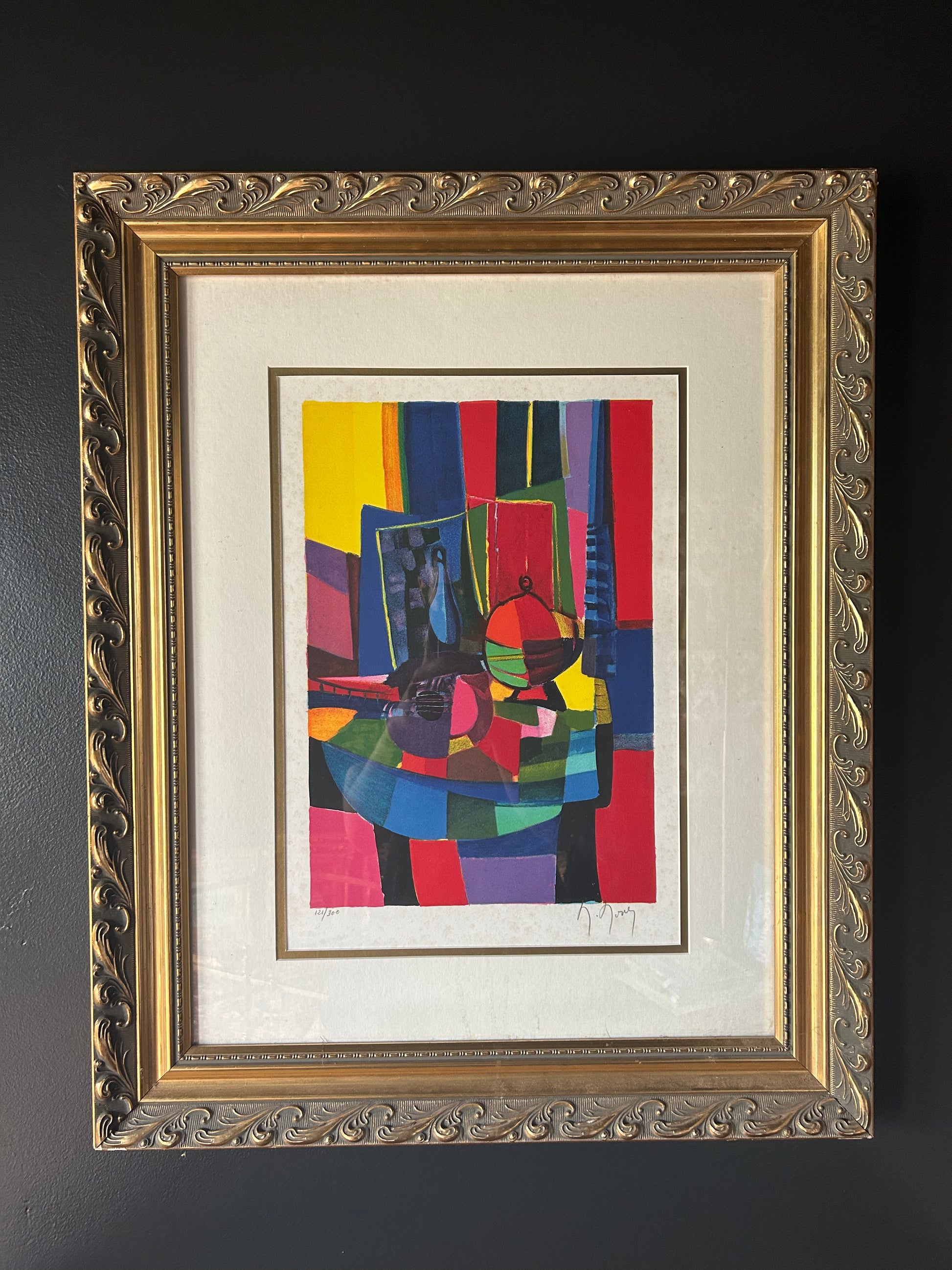 This framed Marcel Mouly lithograph is a showstopper stunning. It blends warm and cool tones perfectly to brighten up your space with an abstract twist. The piece, signed by the artist, could be featured as the star or accent in any space!