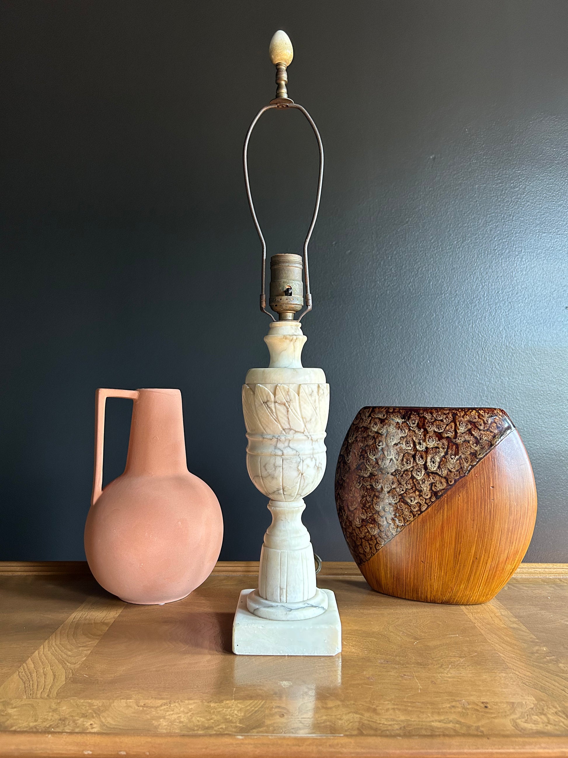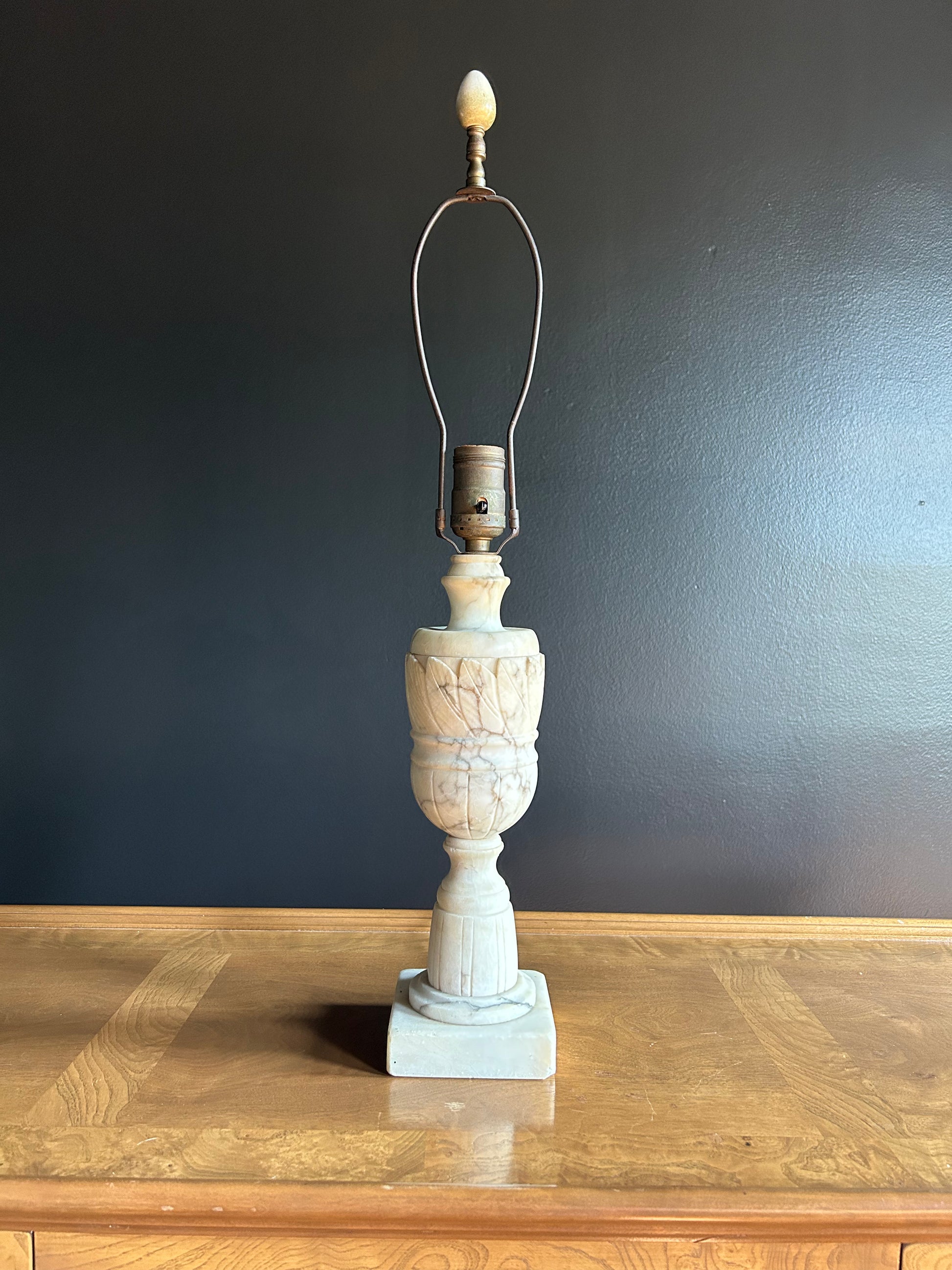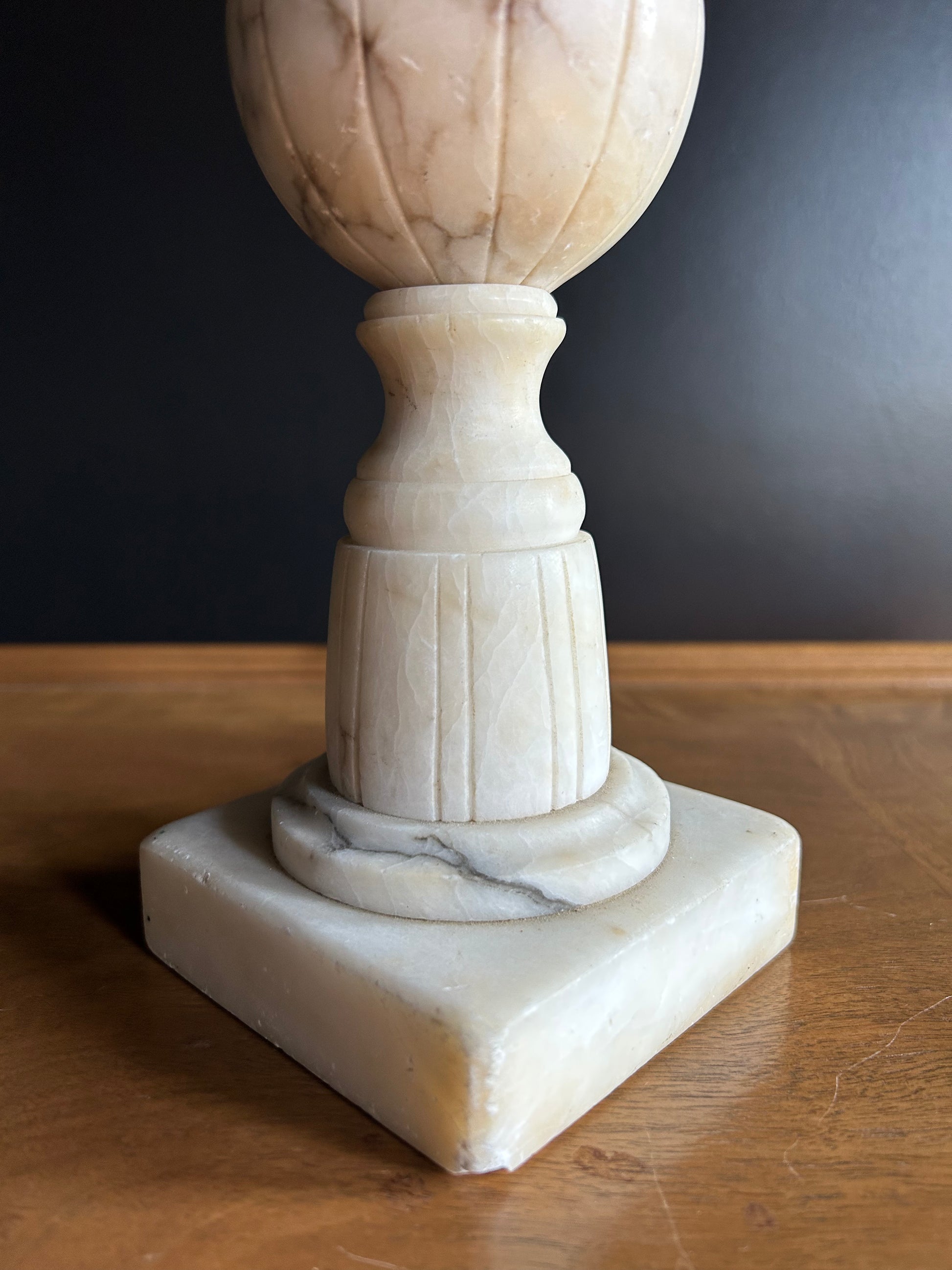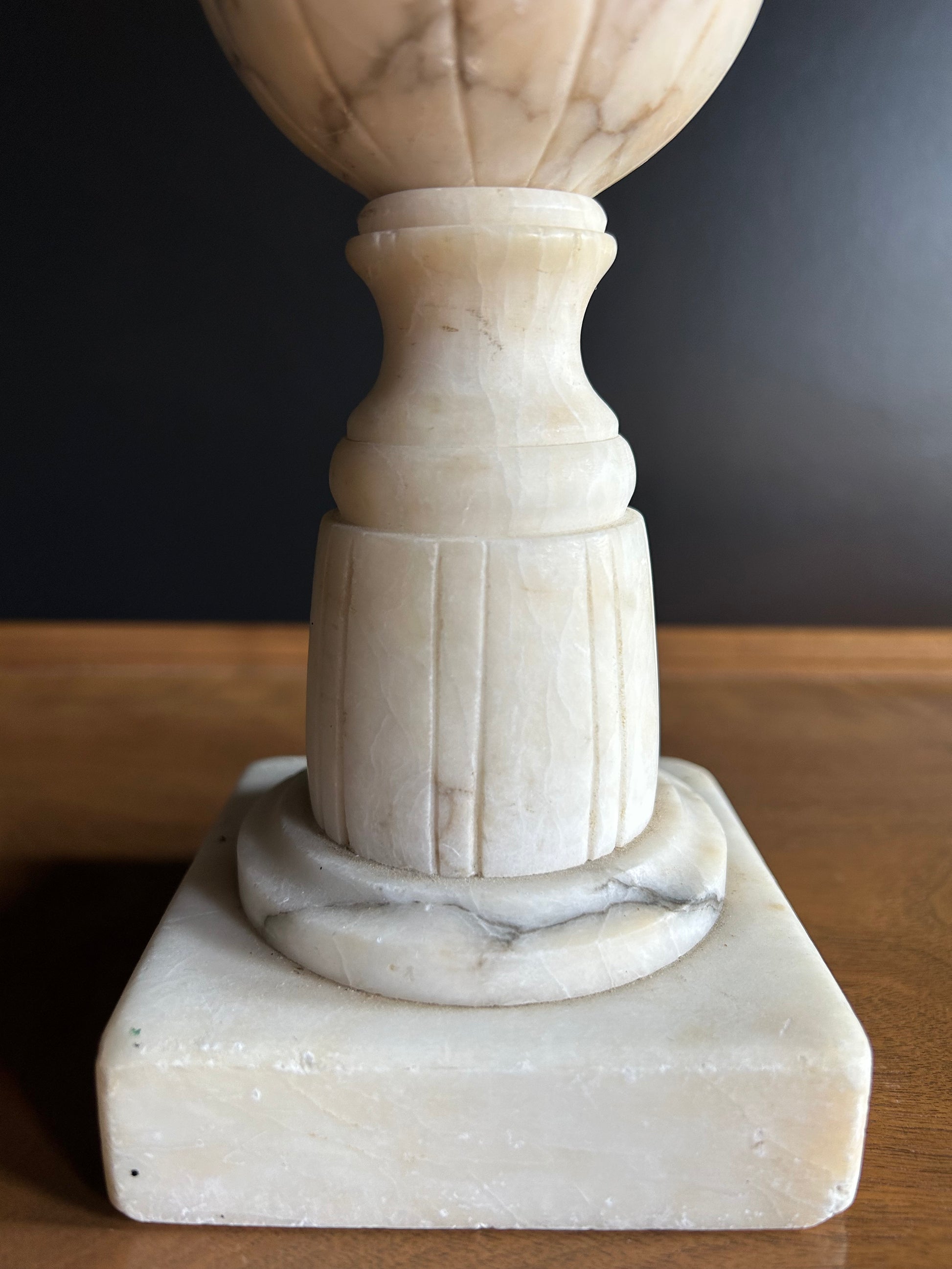 Vintage Neoclassical Italian table lamp crafted from alabaster, showcasing lovely carved details and a distinctive shape. This lamp is perfect for creating a romantic ambiance in any room. Alabaster lamps are timeless and versatile, adding a touch of class, style, and prestige to any decor.