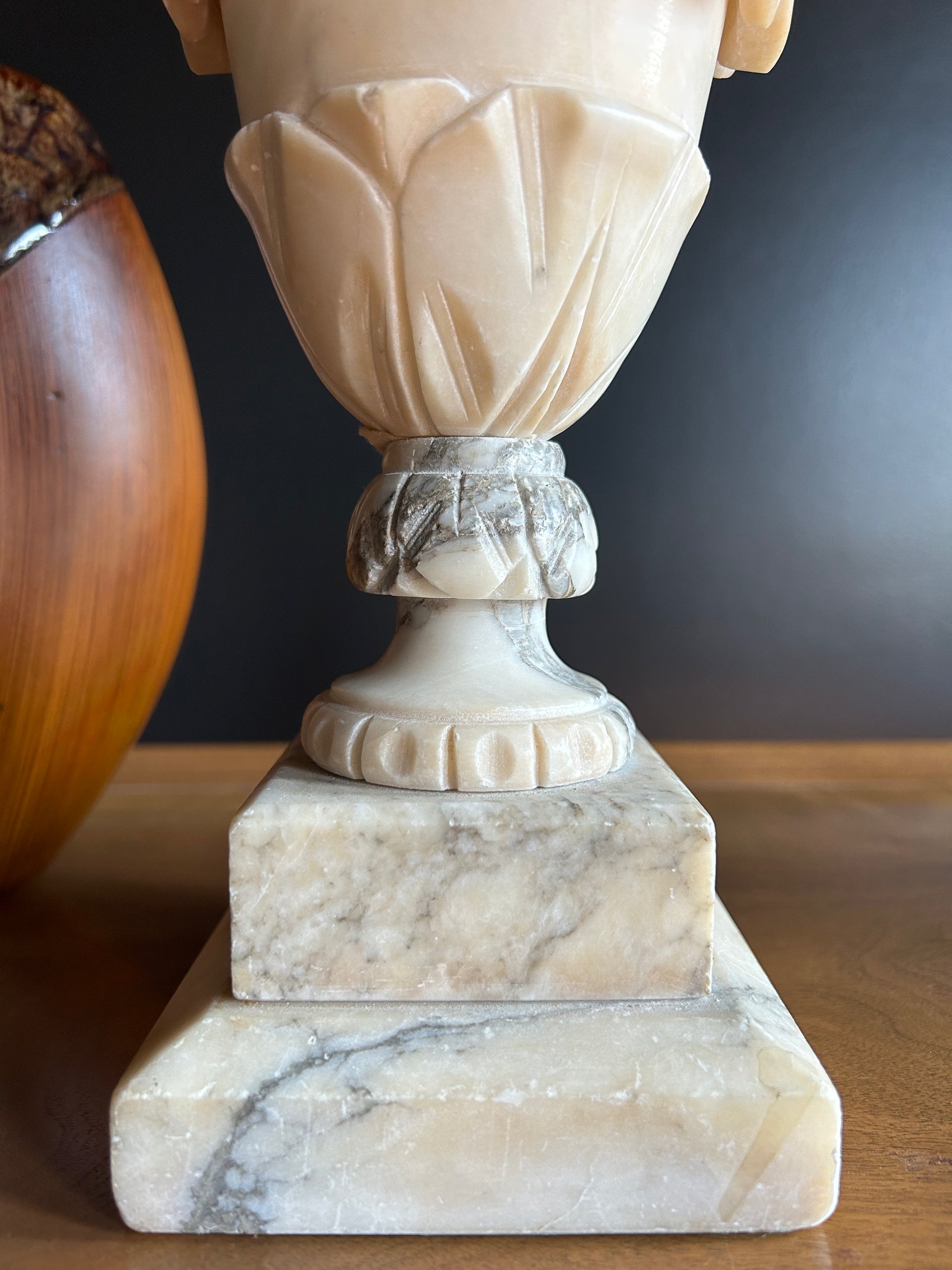 This is an elegant Alabaster lamp in a graceful baluster form, adorned with stylized leaves on the neck and a stepped square plinth. It features delicate swag details and gorgeous marbling throughout. Truly a statement piece.
