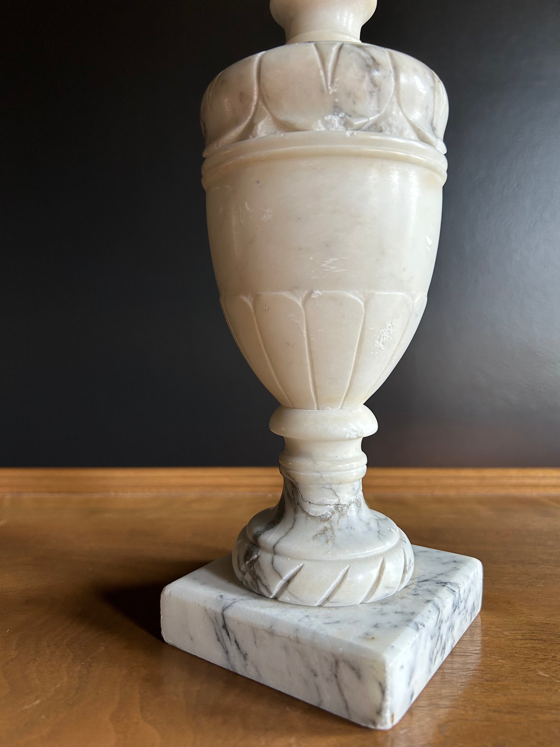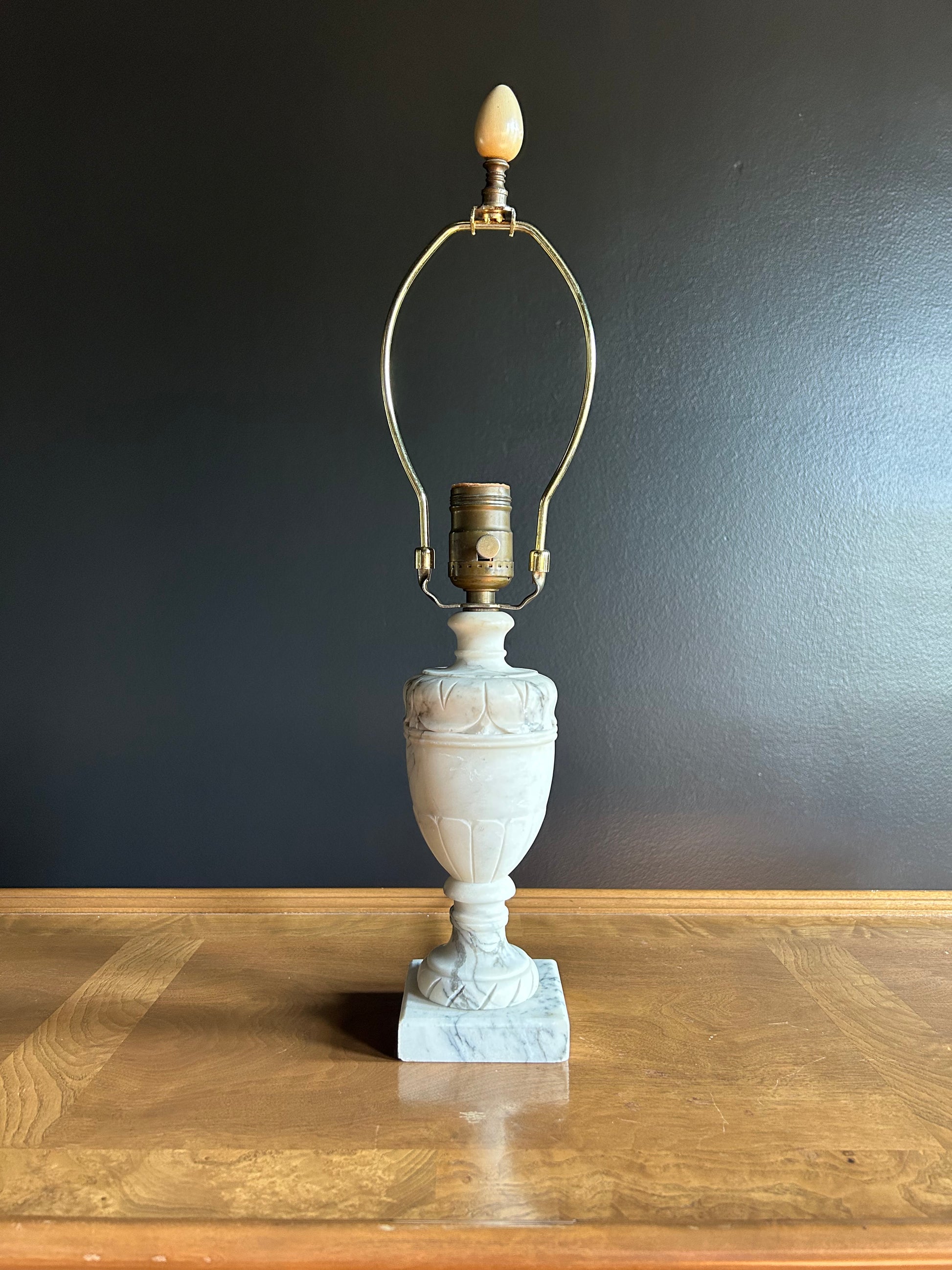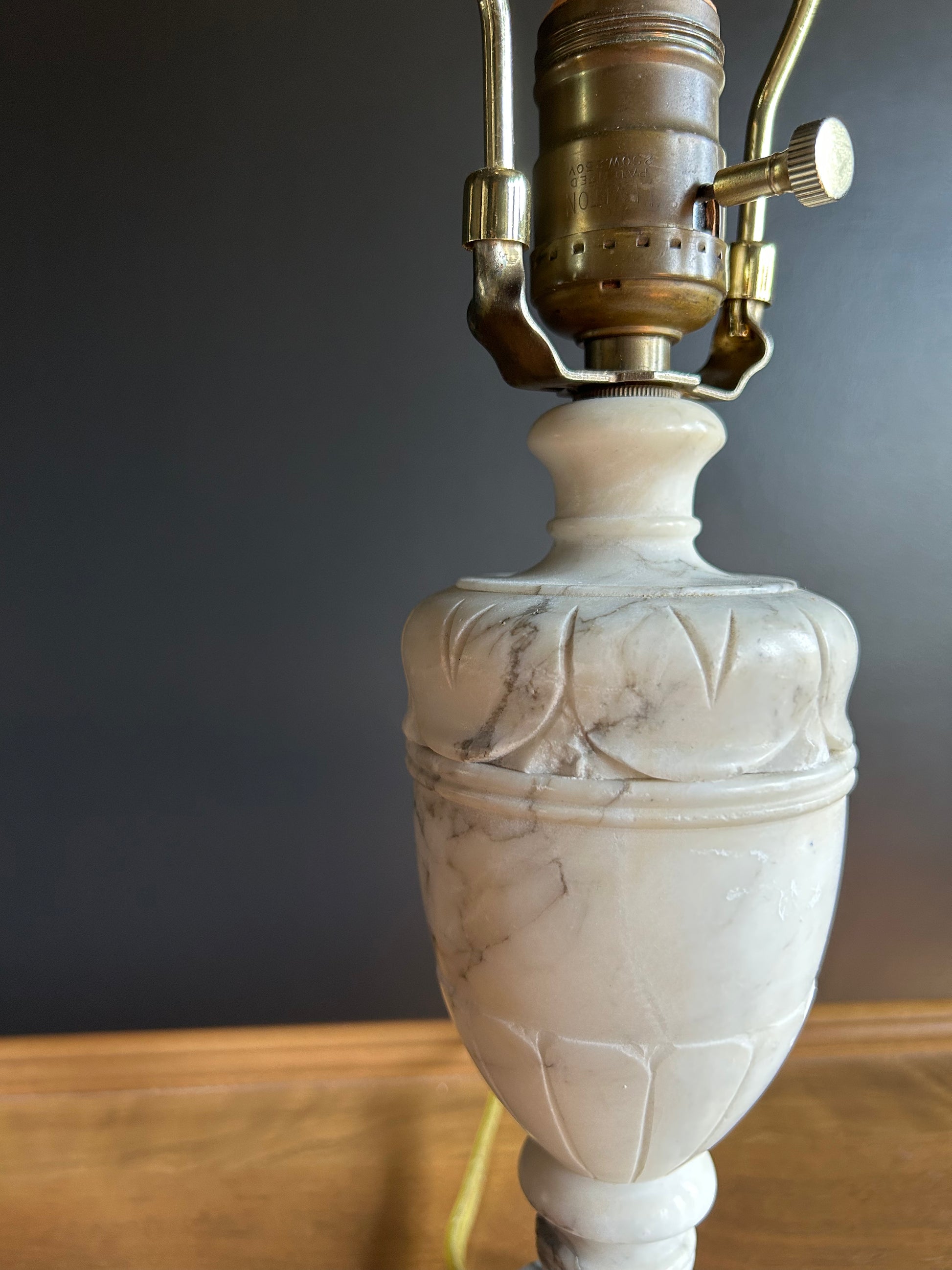 This petite vintage table lamp crafted from Italian alabaster, showcases lovely carved details and an understated shape. Alabaster lamps are timeless and versatile, adding a touch of class, style, and prestige.