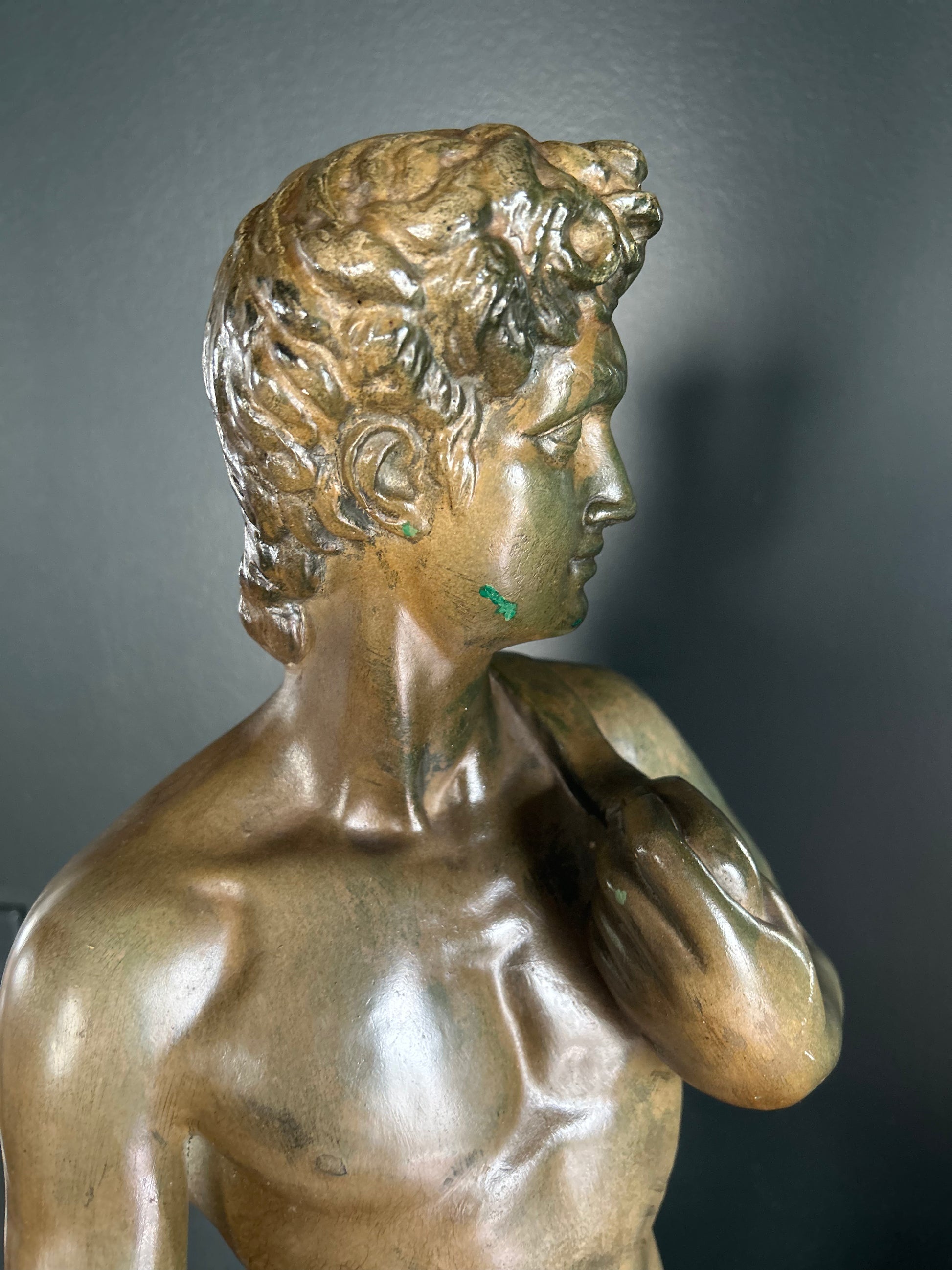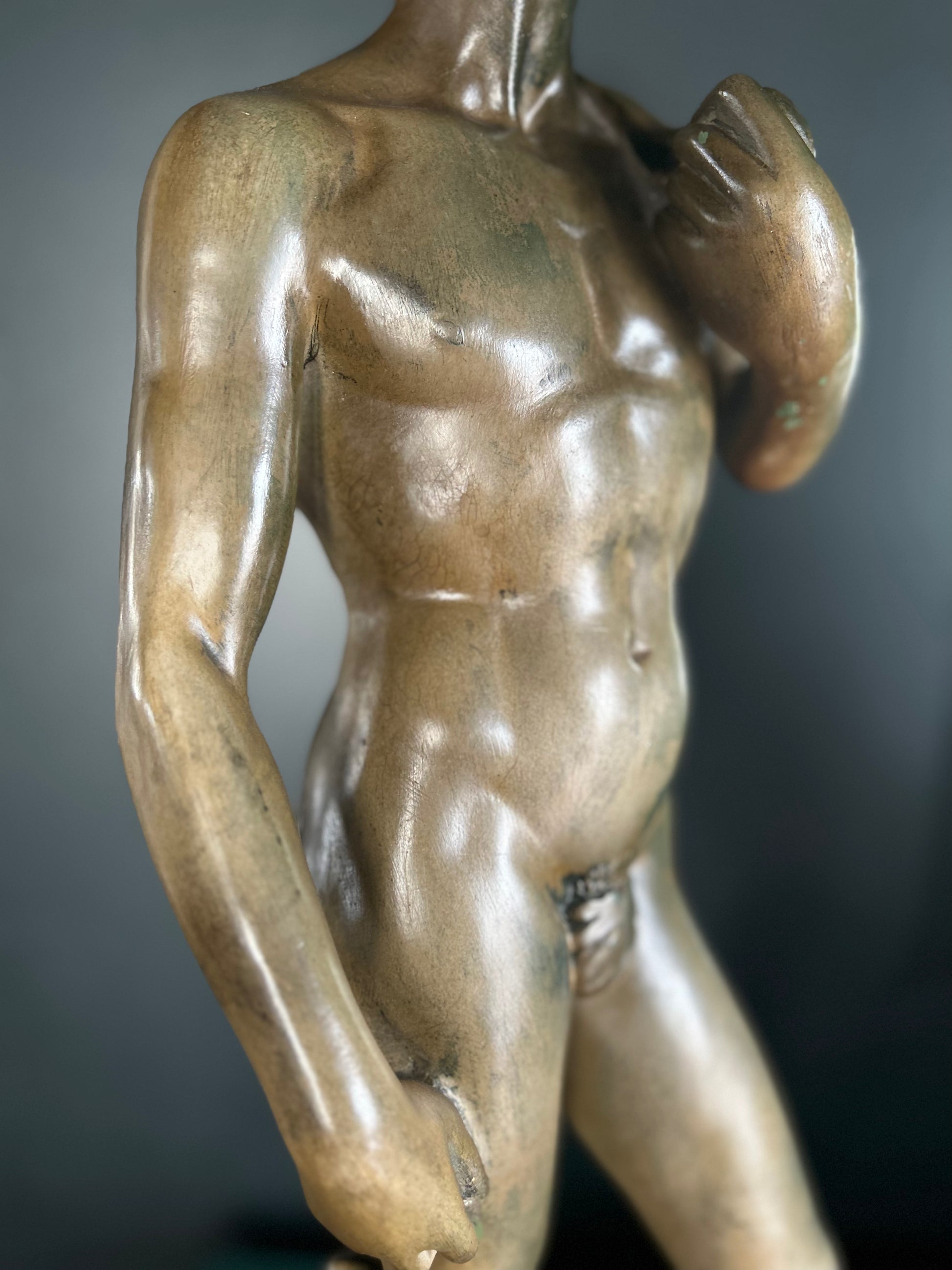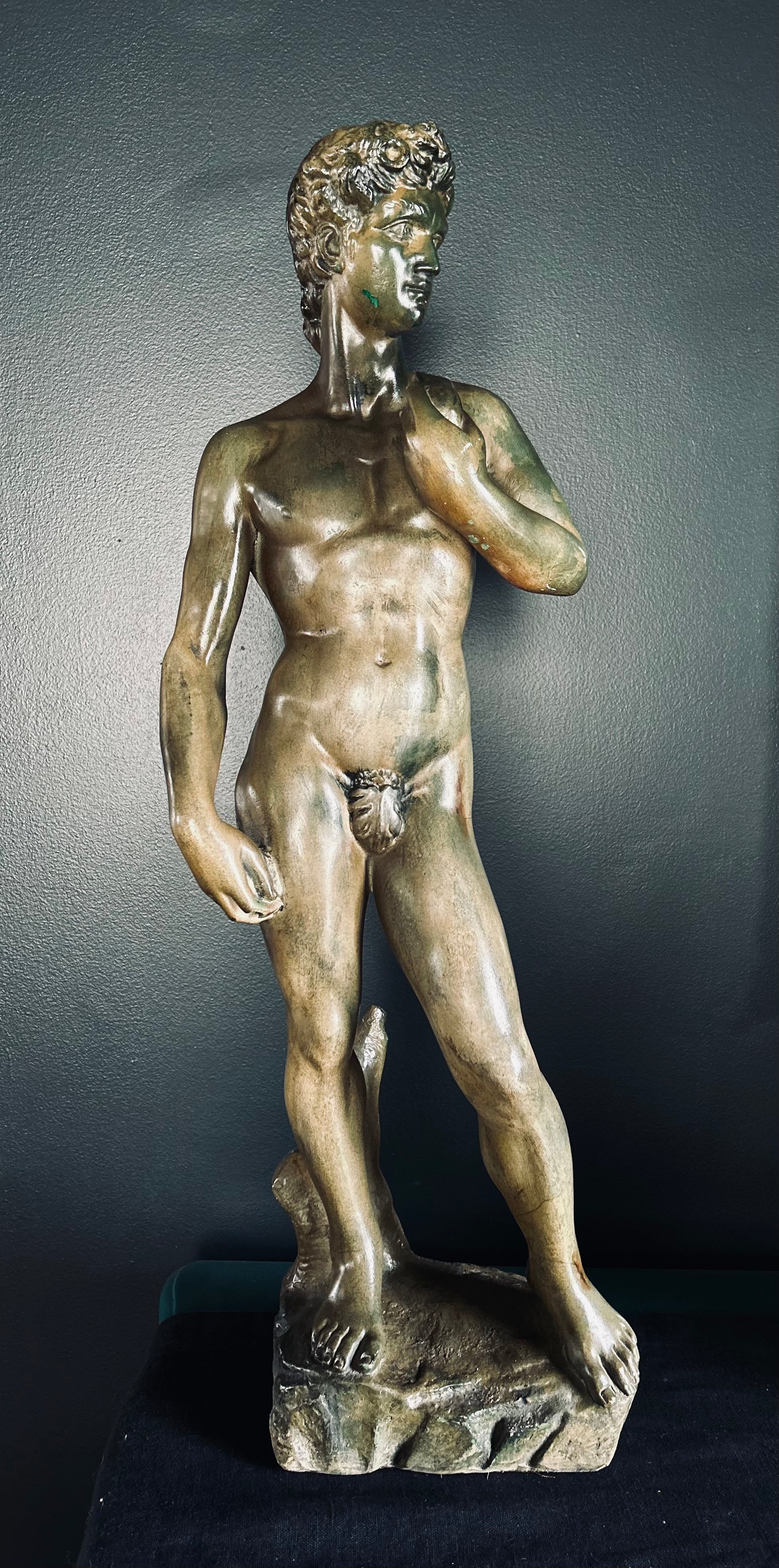 This statue captures the timeless beauty of Michelangelo's David with vintage bronze. Meticulously crafted, this solid and very heavy casting showcases the artistry of Italian manufacture from the second half of the 20th century. Despite normal signs of aging on the patina, this statue is in great condition. There appears to be one mark on the face of the piece (pictured), which could be easily masked.