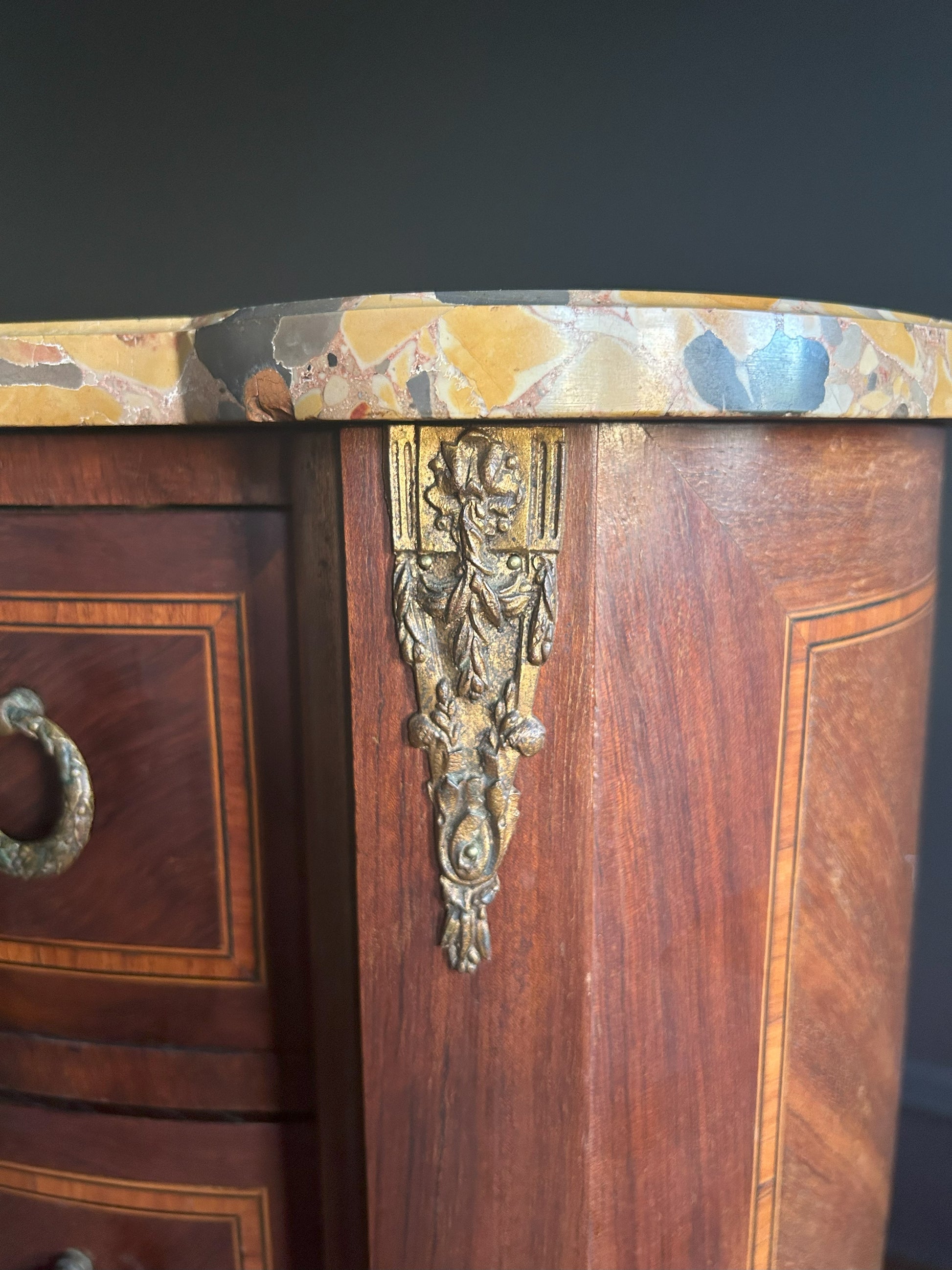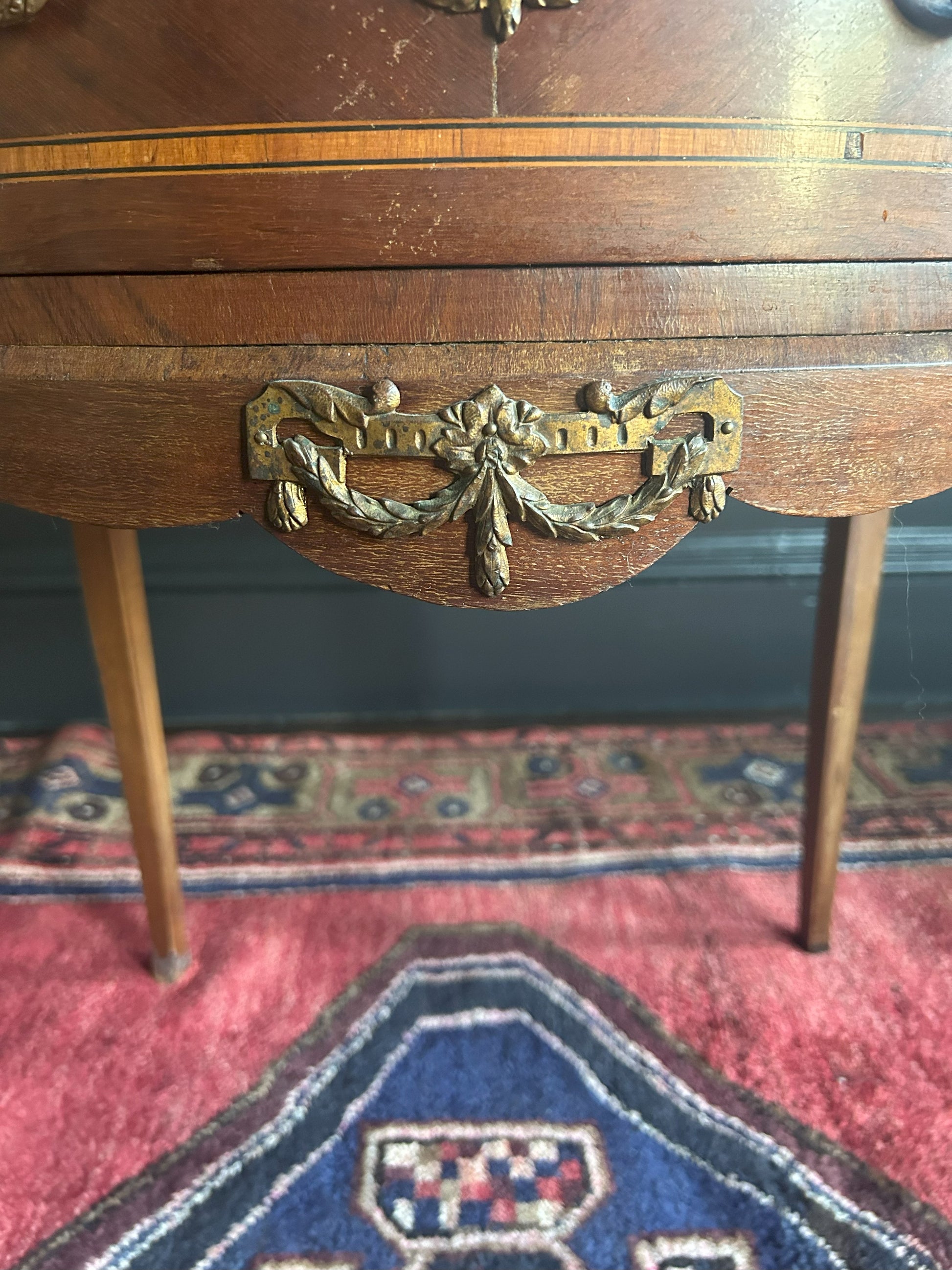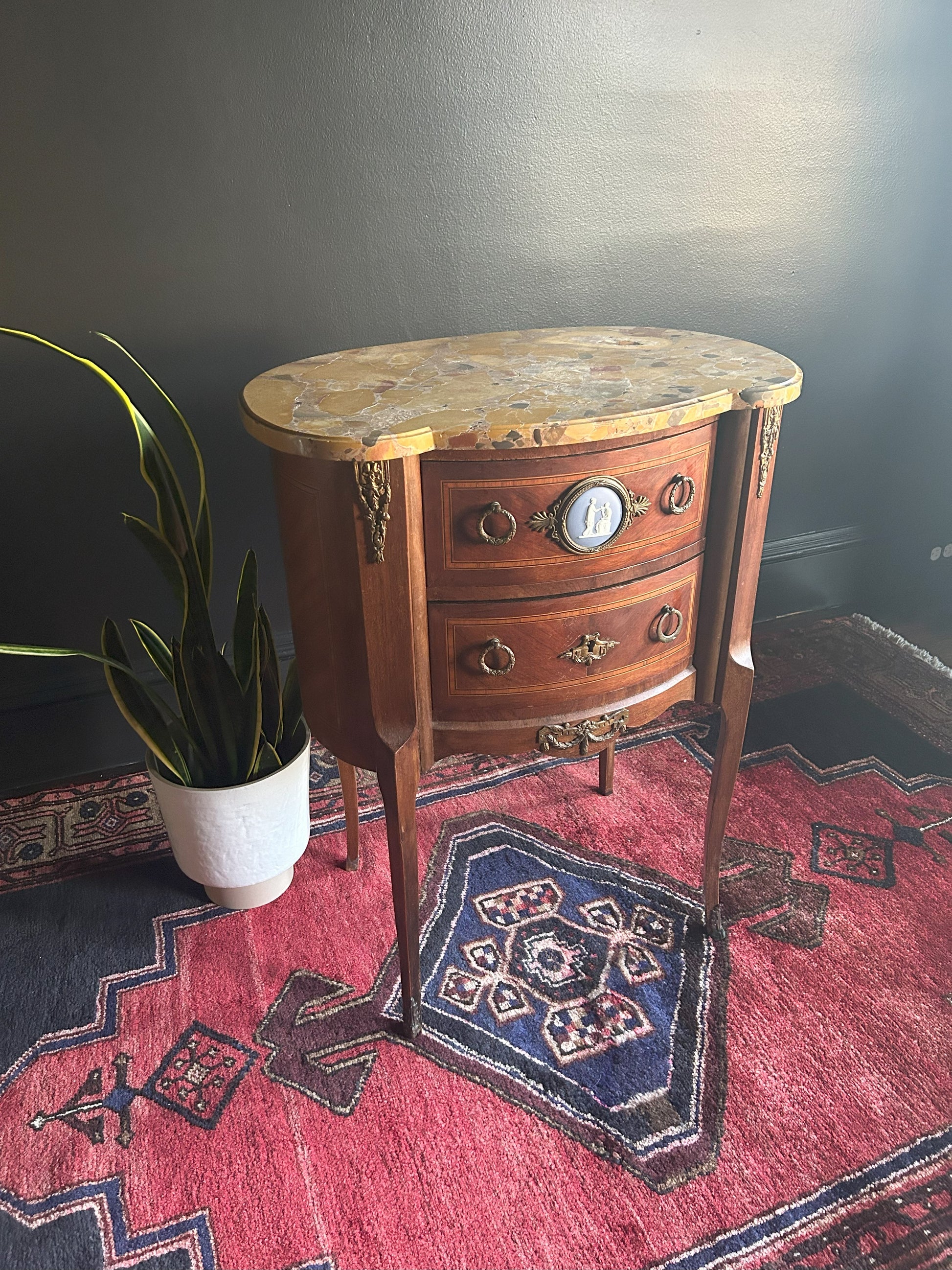 Built in the early 1900s, this French carved inlay table features intricate inlay work, brass/bronze accents, marble top and gilt bronze ormolu mounts. With two dovetailed drawers for storage, it exudes both elegance and functionality. The Wedgewood style jasperware medallion really brings this piece to live. What a historic gem.