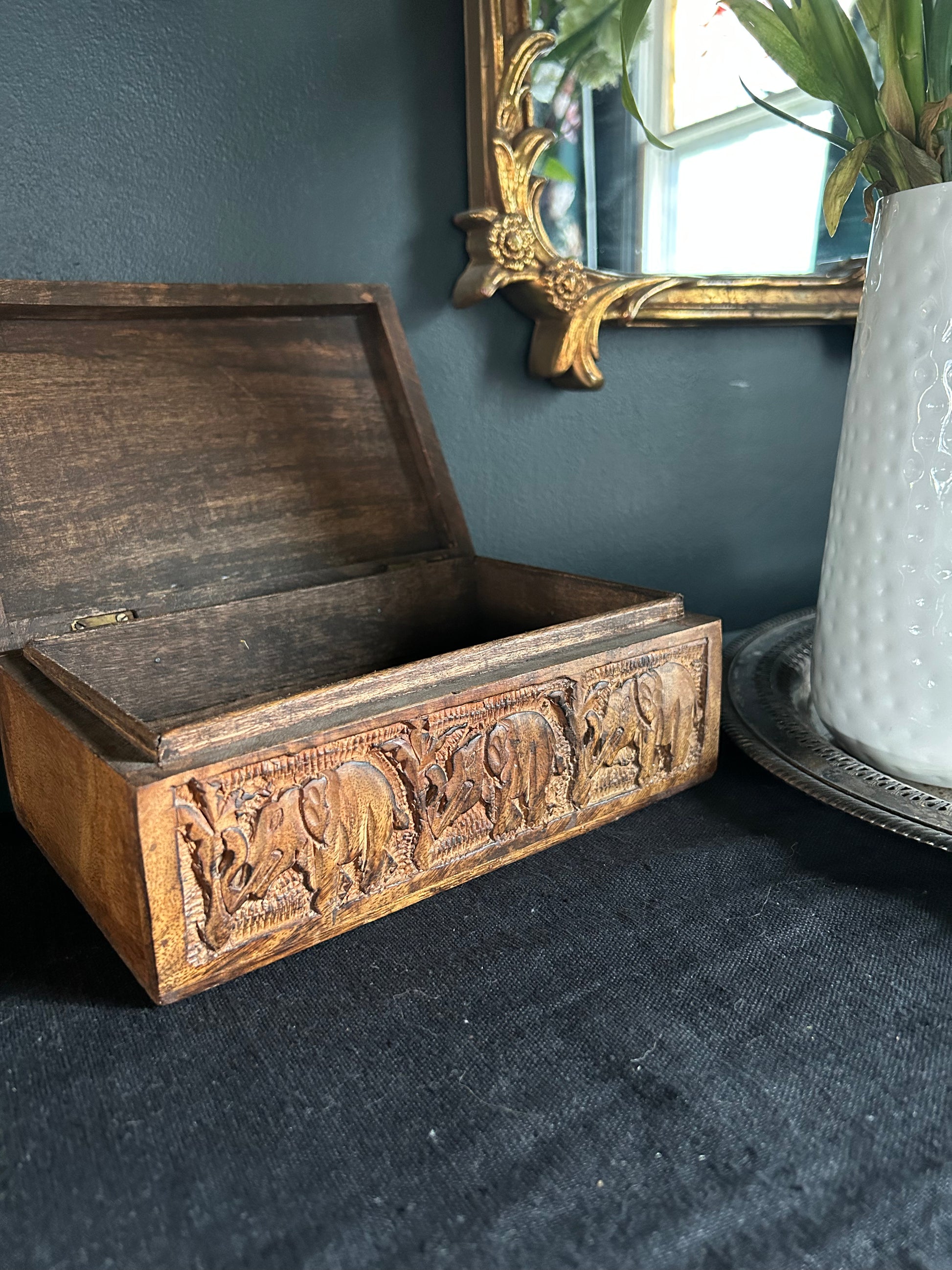 This handcrafted wooden box merges artistry and functionality, showcasing an intricately carved elephant design.