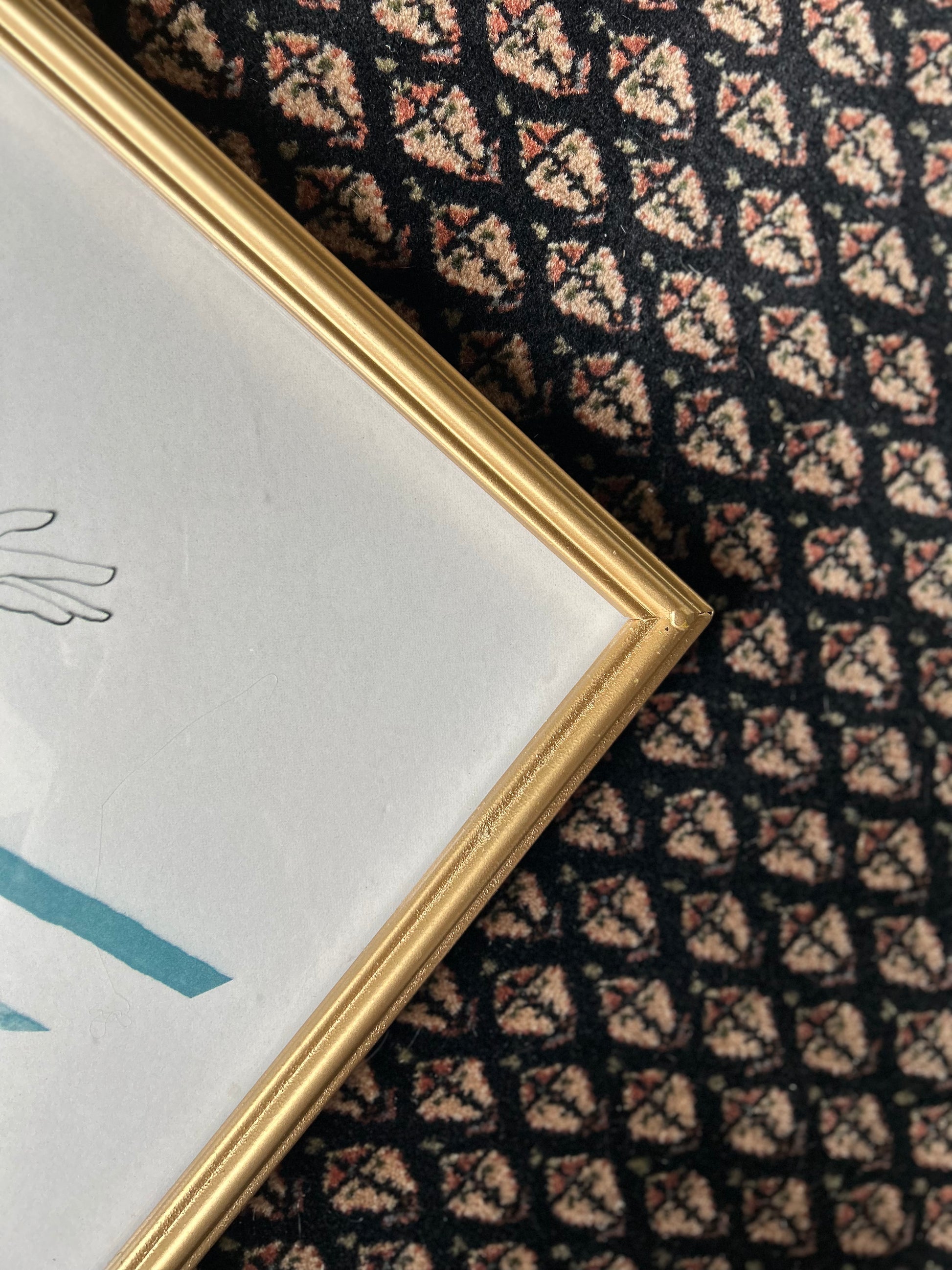 She steals the show! This unusual piece showcases a captivating and moody female silhouette using ink and watercolor mediums. Highly stylish, this would add a pop of glam to any number of decor styles, elevating an ambiance without pretense. The piece comes framed in a very heavy metal, potentially brass, which gives it a unique and modernist touch.