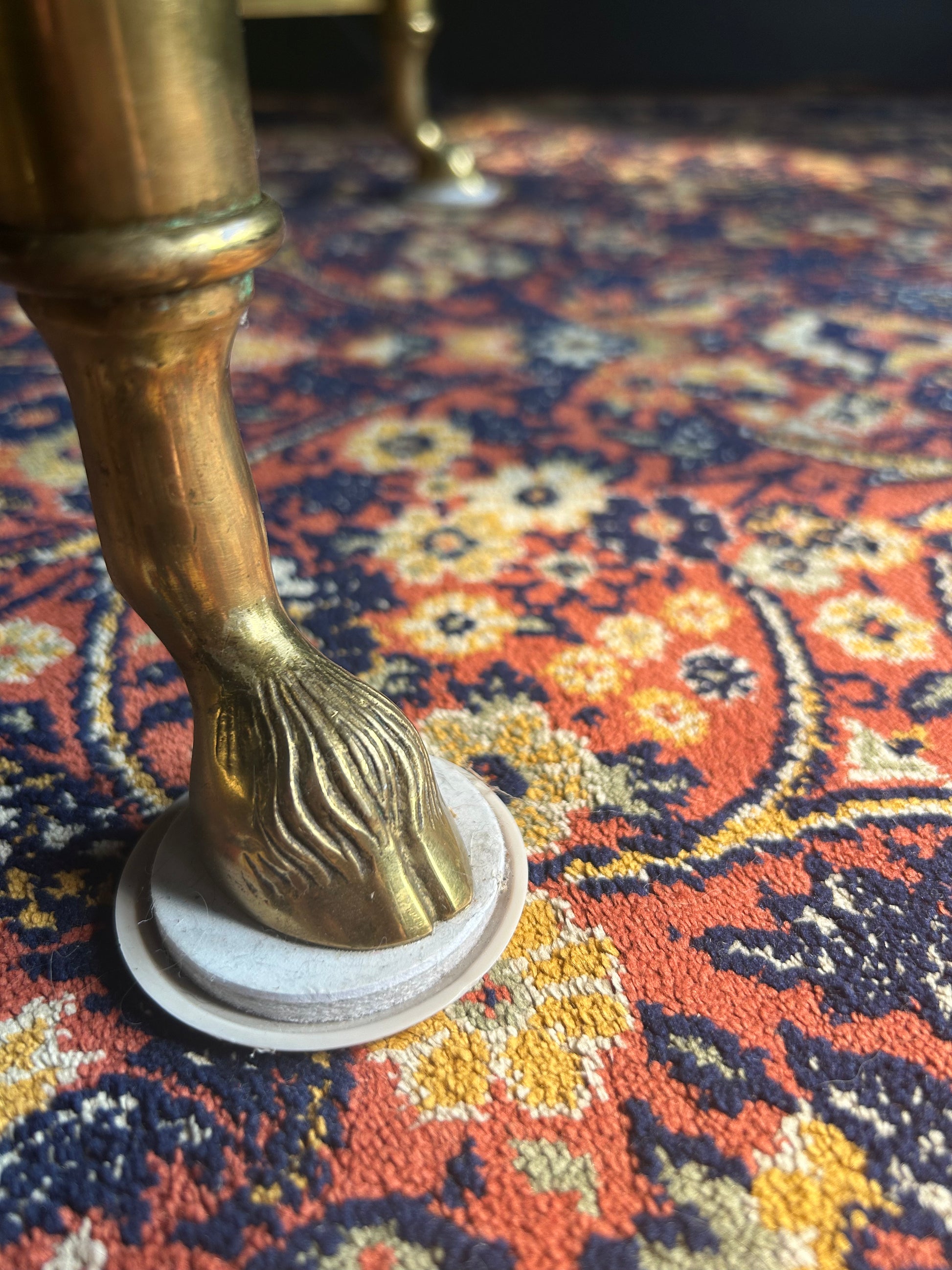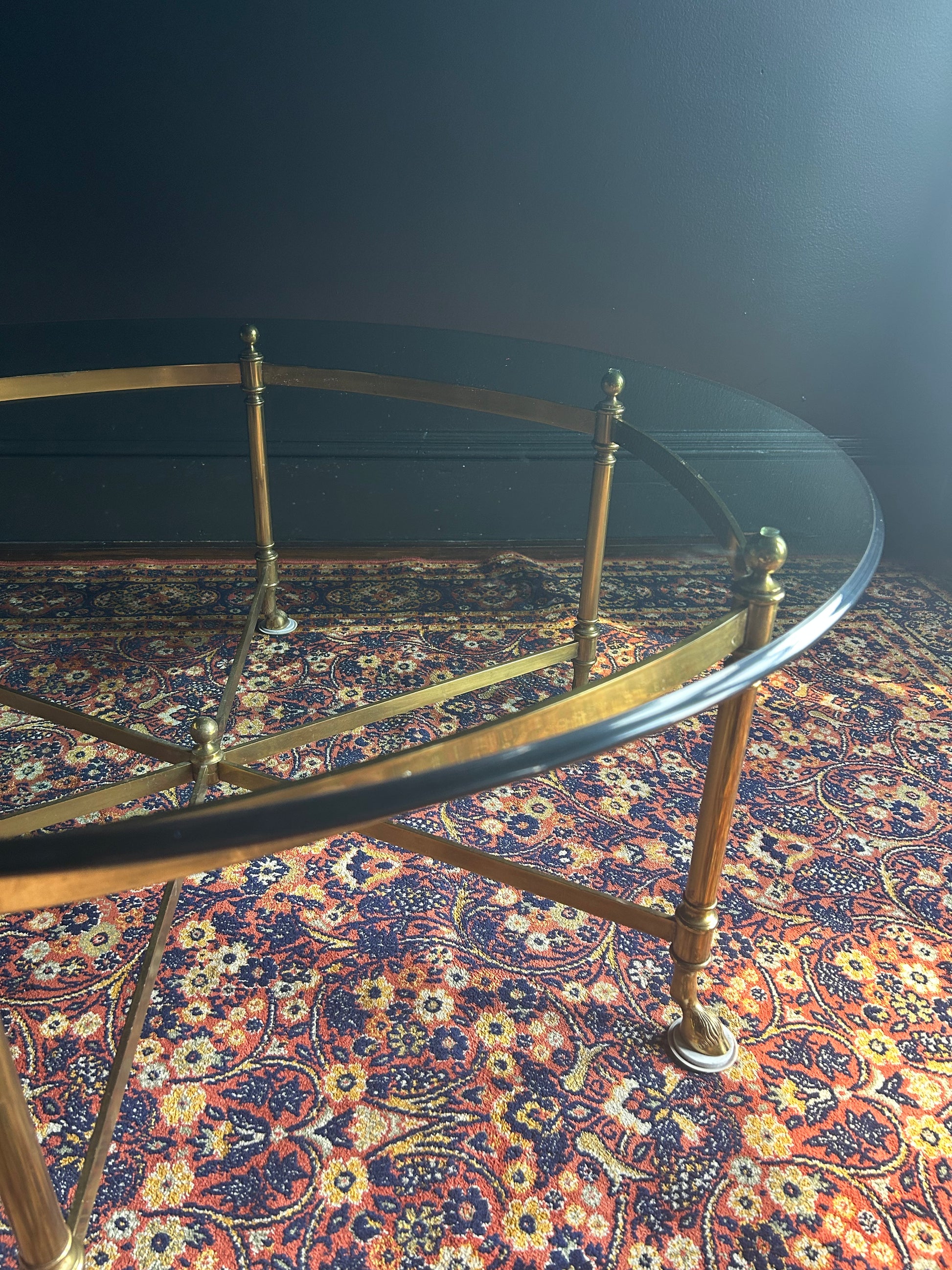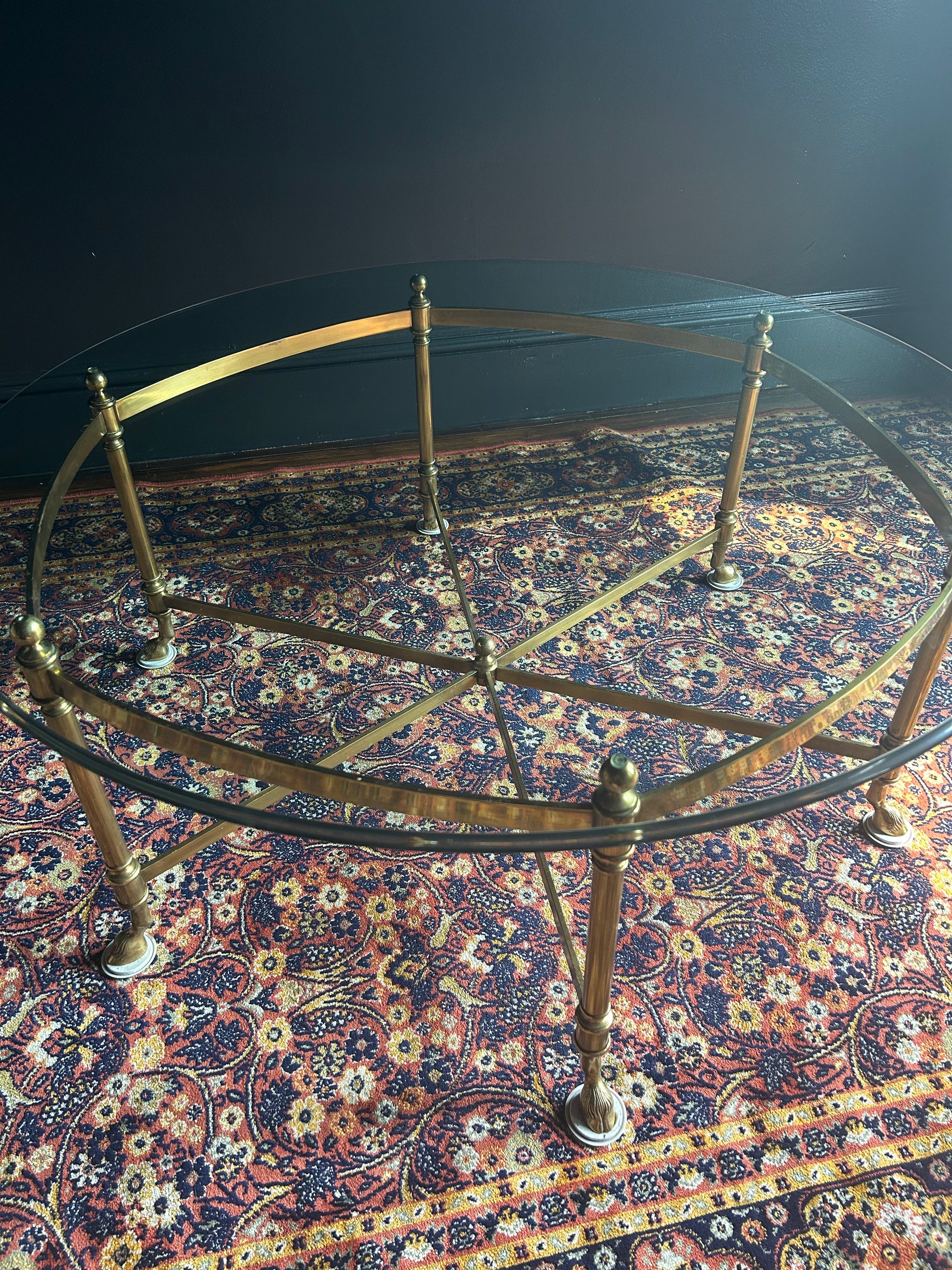 Iconic Italian mid-century modern brass cocktail coffee table made by La Barge. Elegant and eye-catching, this gorgeous piece features a heavy glass top with ogee edge and stretcher bars over beautiful hoof feet.