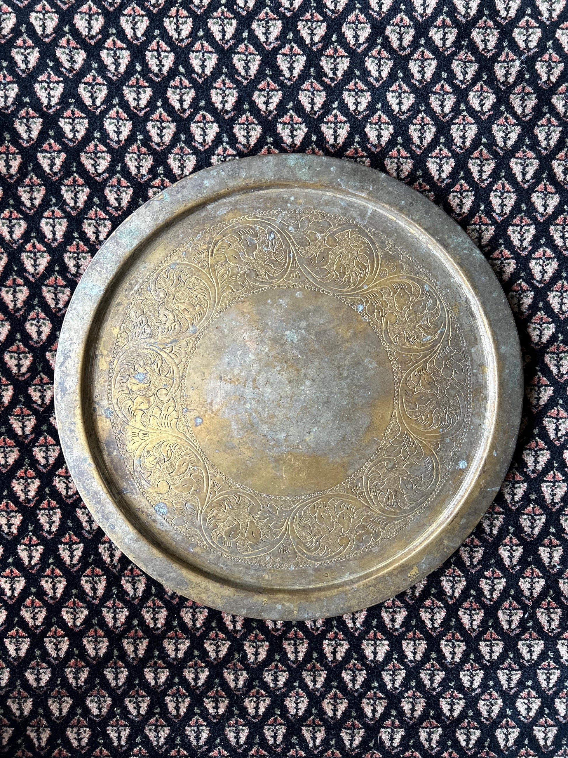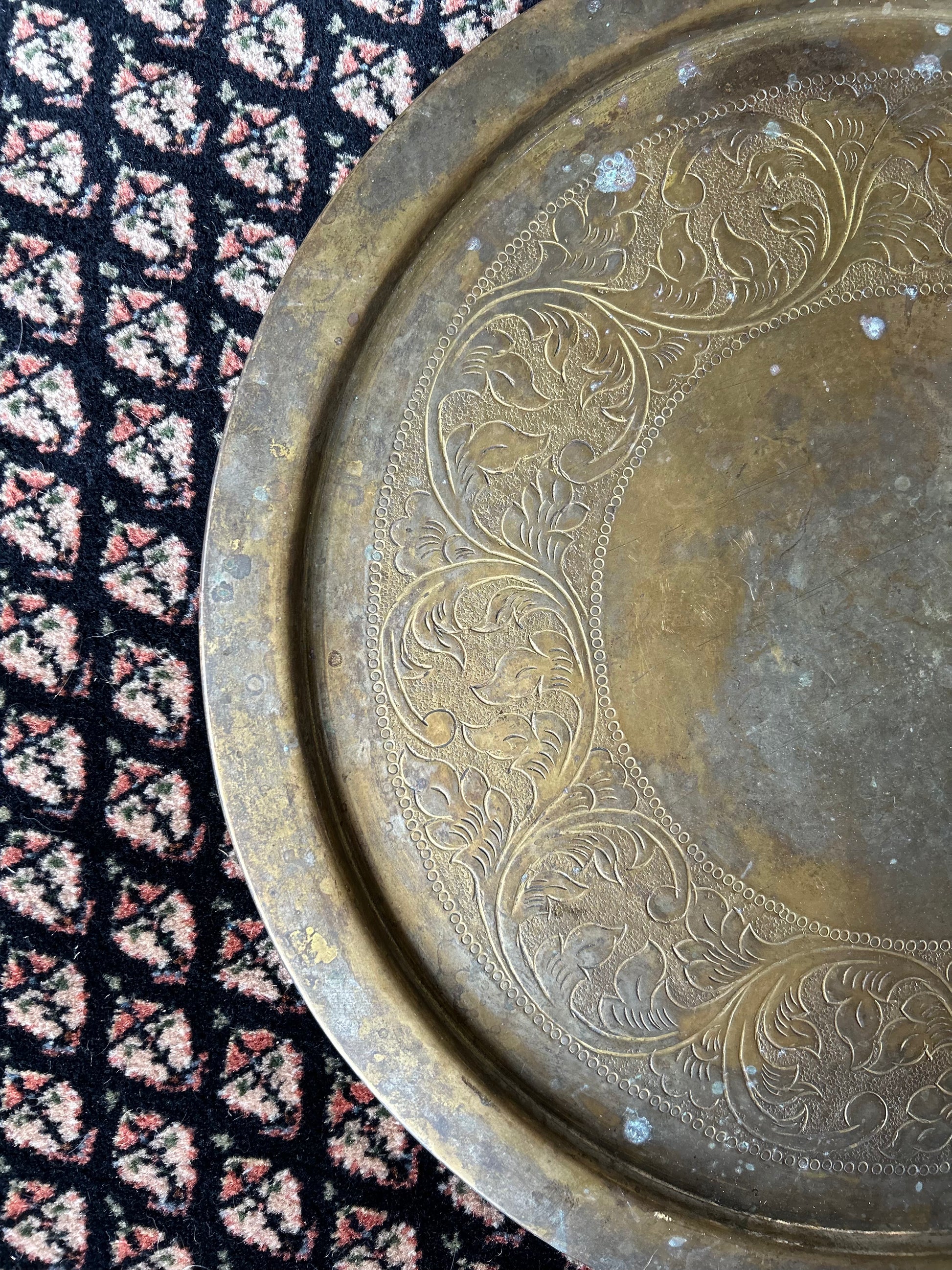 This mid-20th century Moroccan brass tray showcases a unique and ornate swirling motif. It is highly crafted with intricate hand engravings, showcasing remarkable design. It can be used as a decorative piece on a coffee table, ottoman, or even as a dining centerpiece. The tray's size and beautiful details make it perfect for shelf styling or as a wall hanging. Its age has given it a gorgeous patina that adds to its storied appeal.