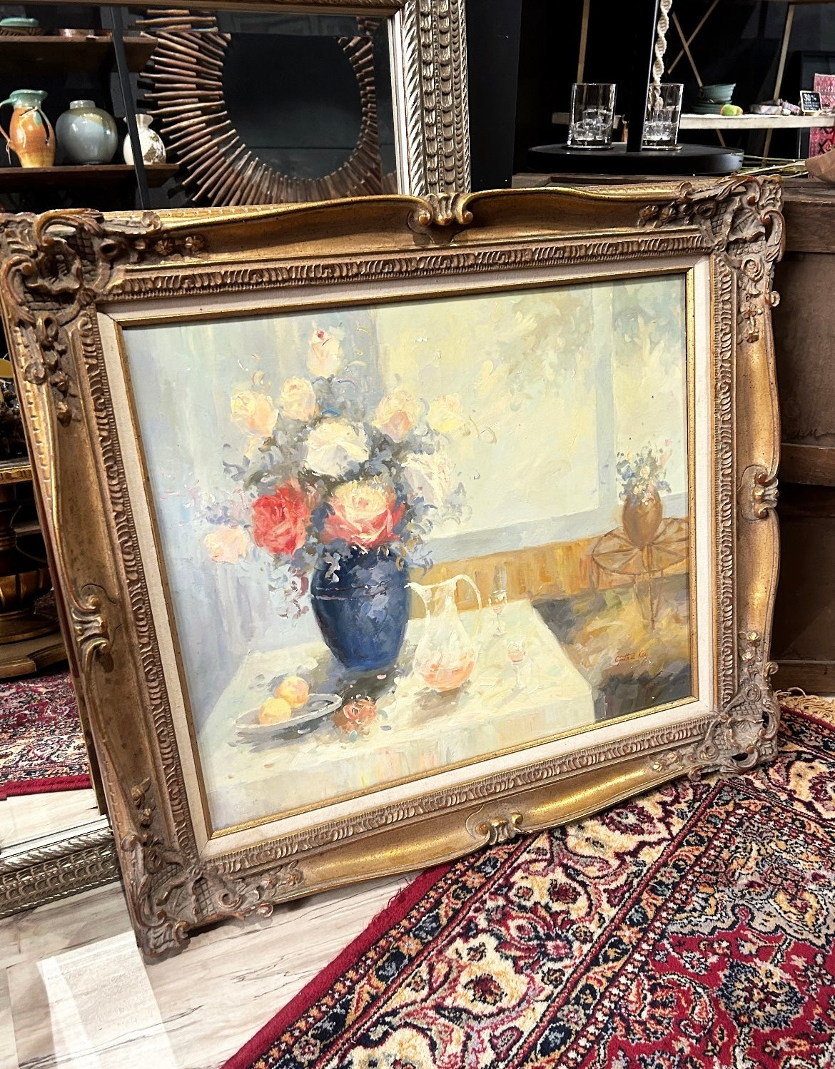 This large, ornately framed original oil by Cynthia Kay would bring a touch of charm and elegance to any space.
