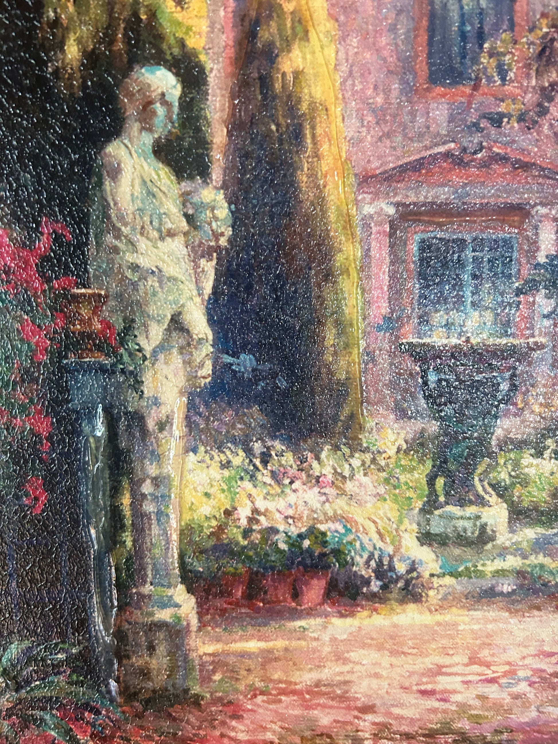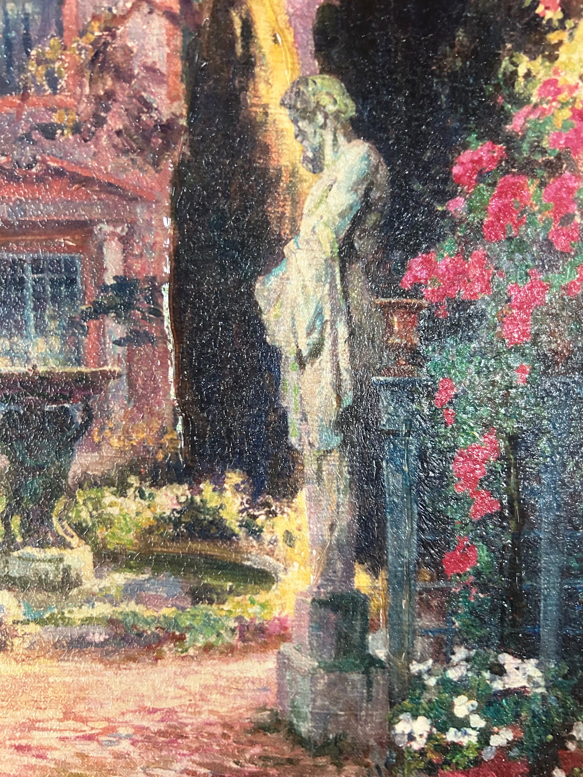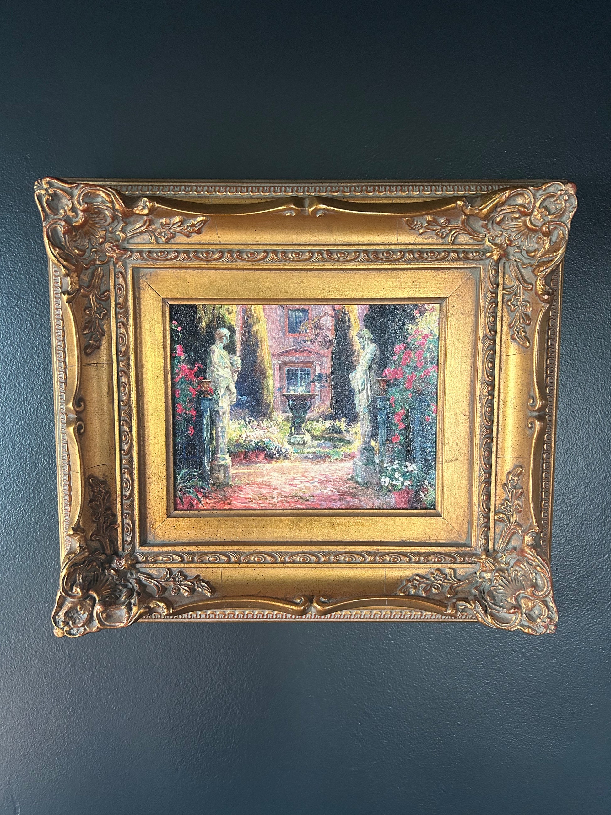 This lovely reproduction of 'Larramet de Belot' is set in a beautiful, heavy gilded frame. The canvas blooms with vivid rouge and terracotta, drawing you into the garden scene.
