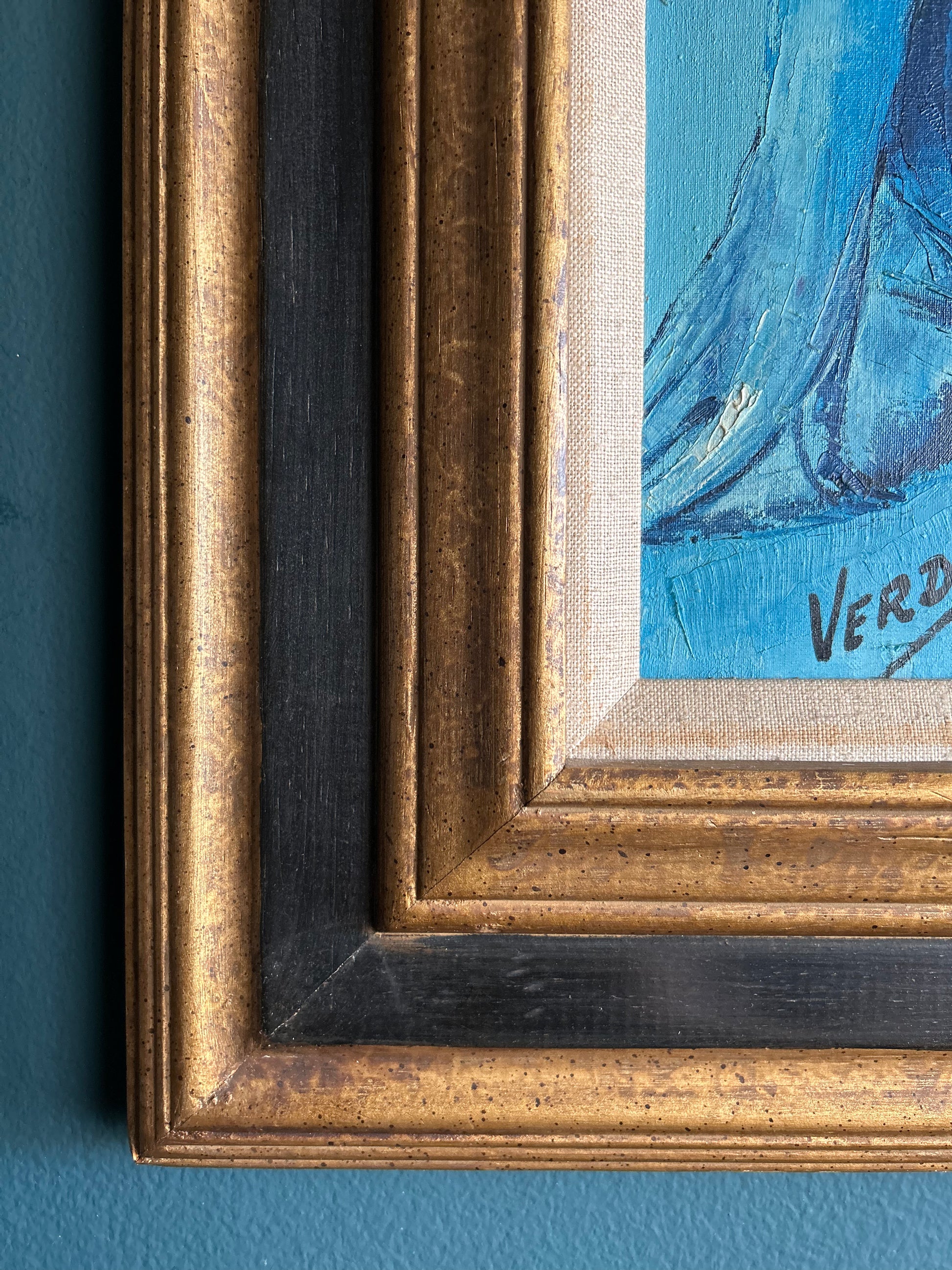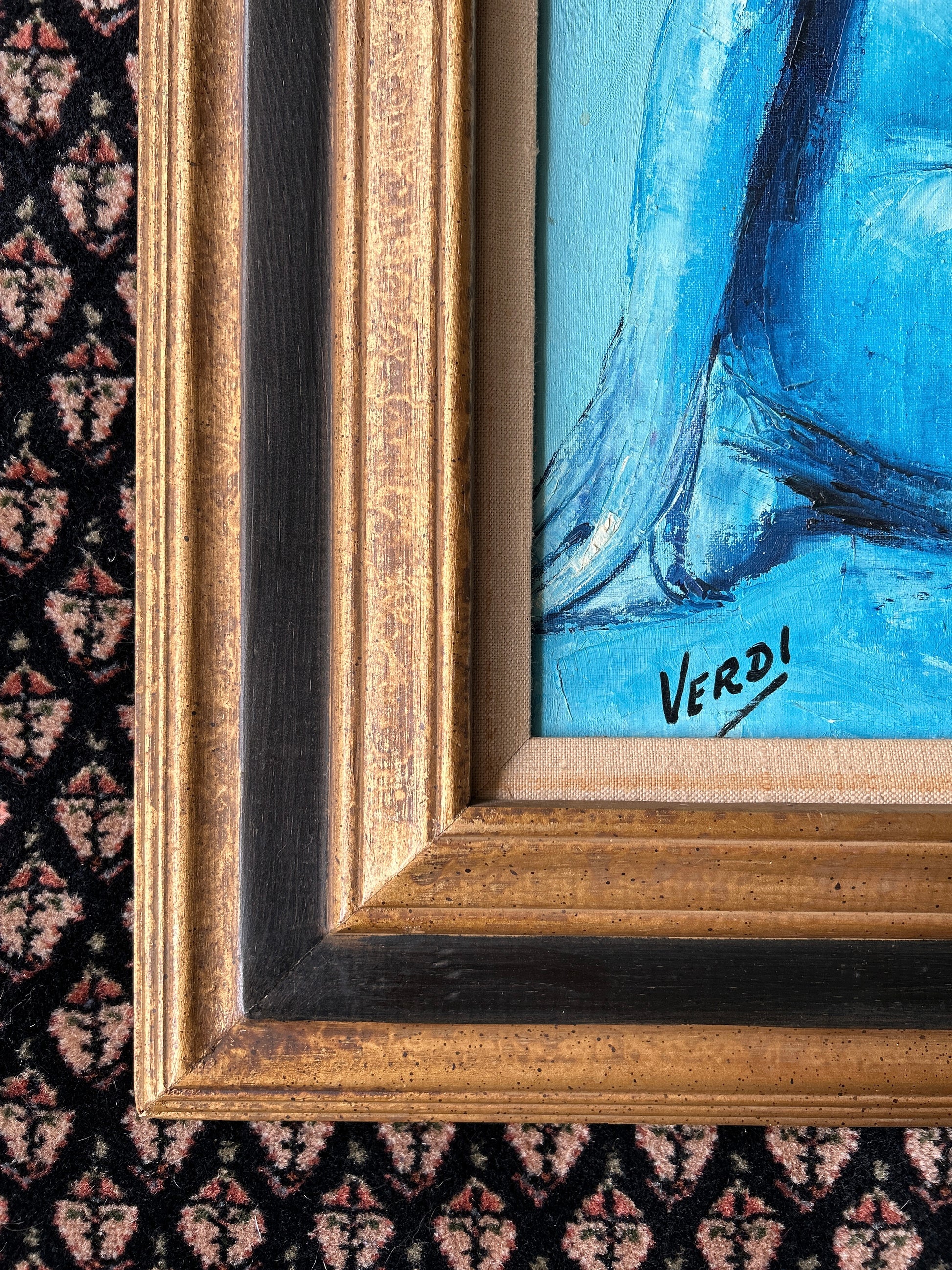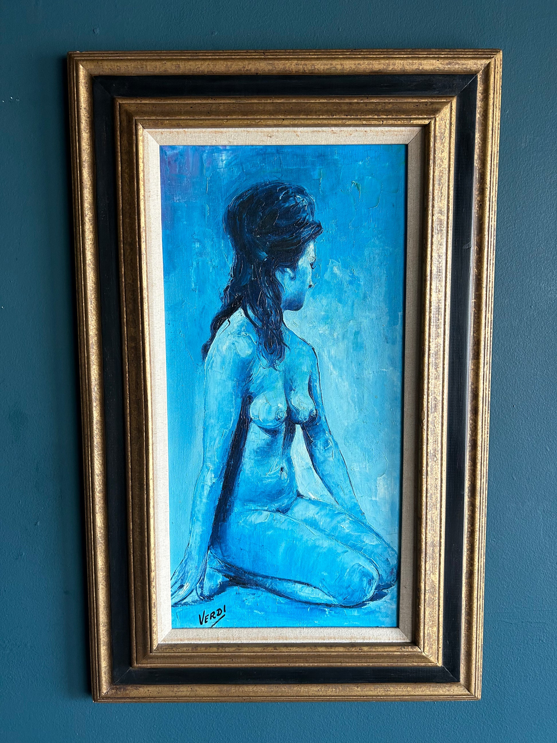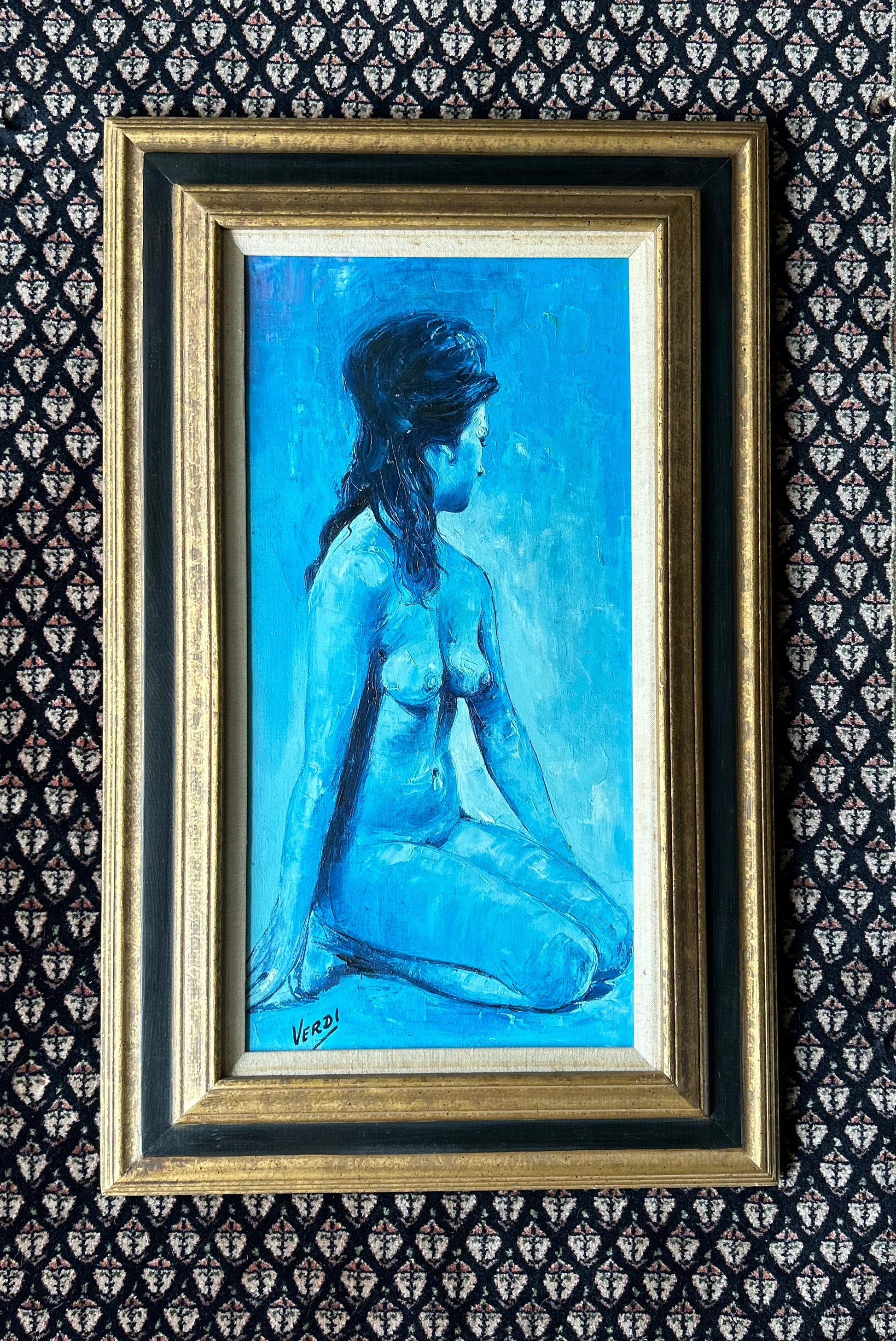 A moody, 1960s original oil painting canvas featuring a lovely nude female figure. Signed by artist J.M Verdi, the painting is done in blues, grays, black and white and it is signed in the lower left corner. One of a kind artwork.