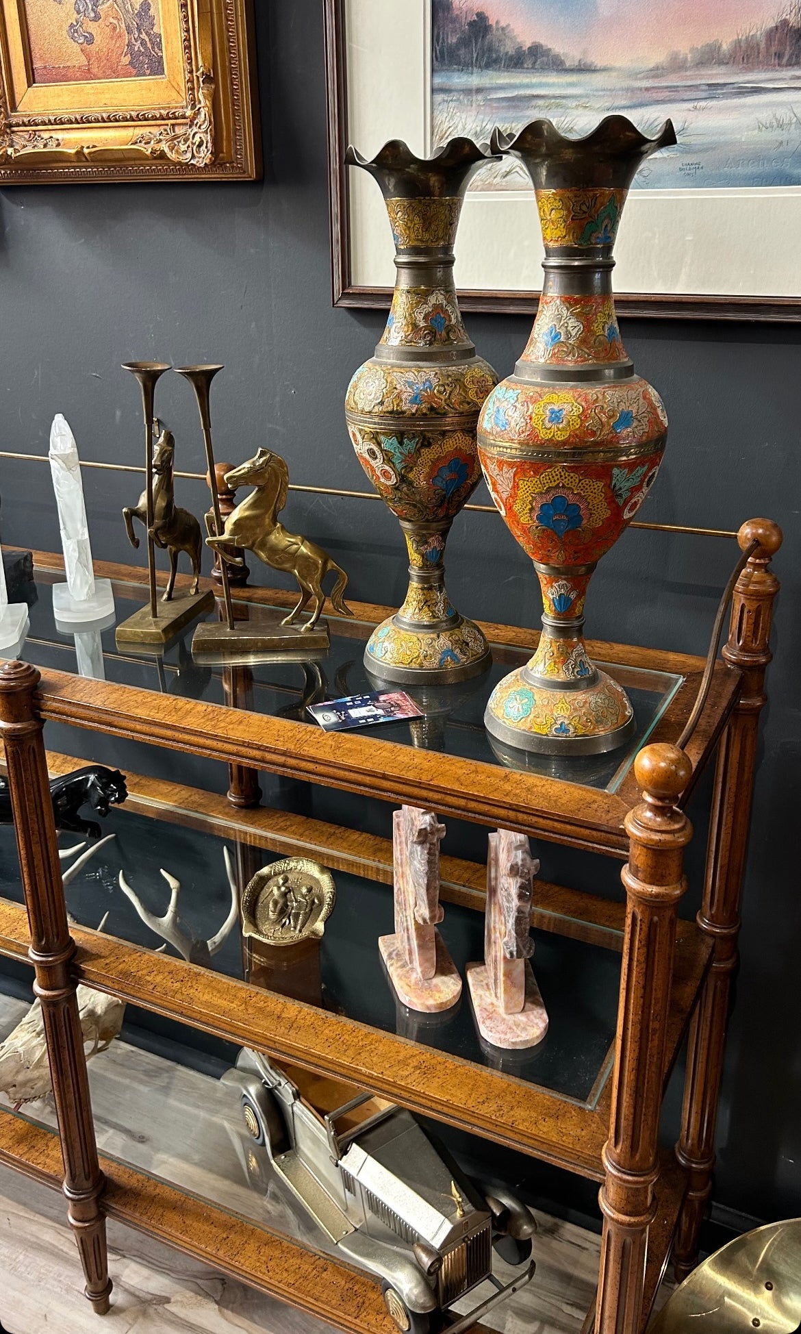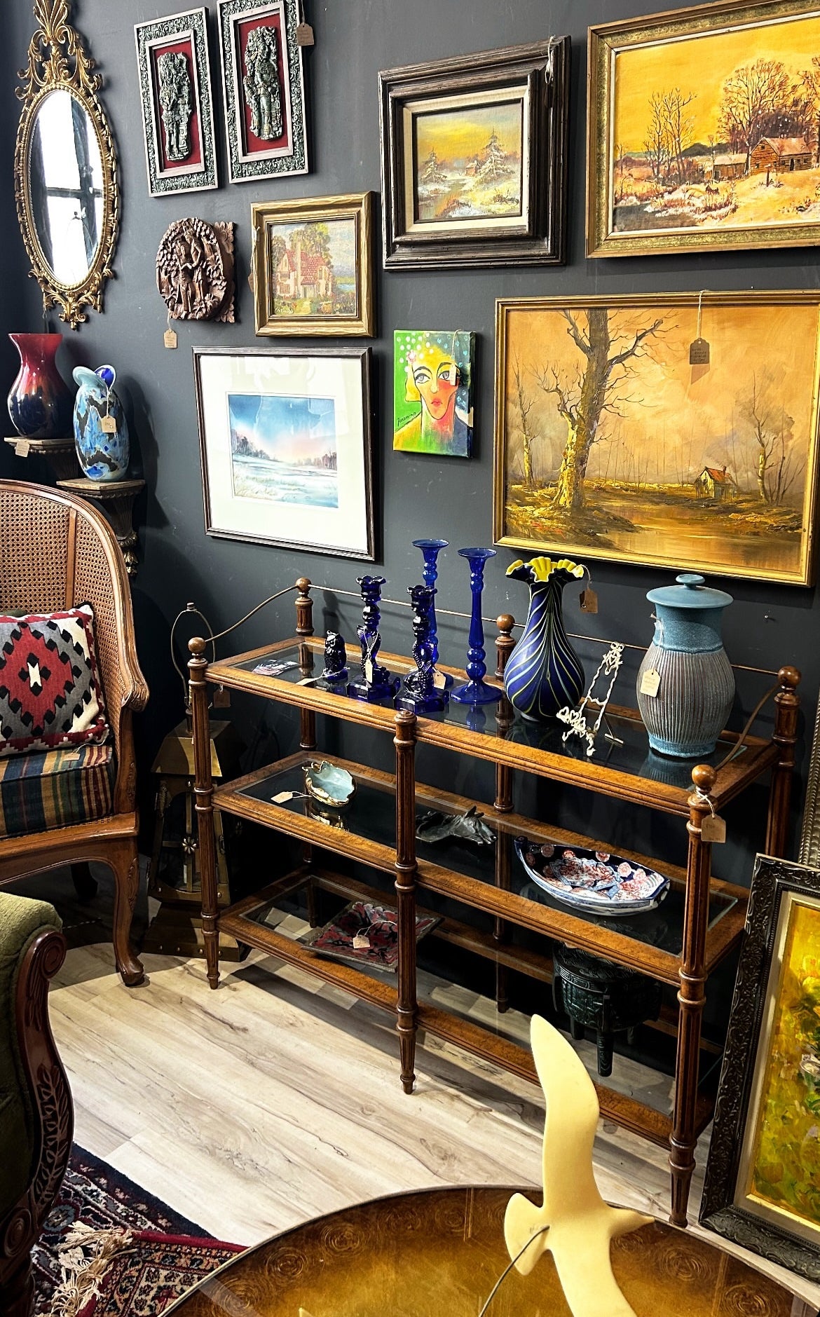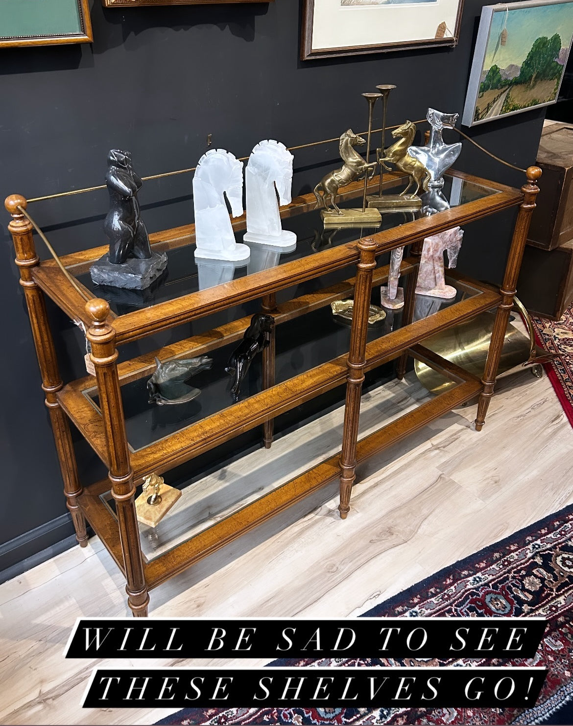 This three-tiered console table is crafted from mid to deep-toned wood and features three shelves, each with a glass base, adding a contemporary touch. The rich burlwood paired with transparent glass creates an intriguing visual contrast. This piece would add a functional and stylish pop to an office, living room, or bedroom.