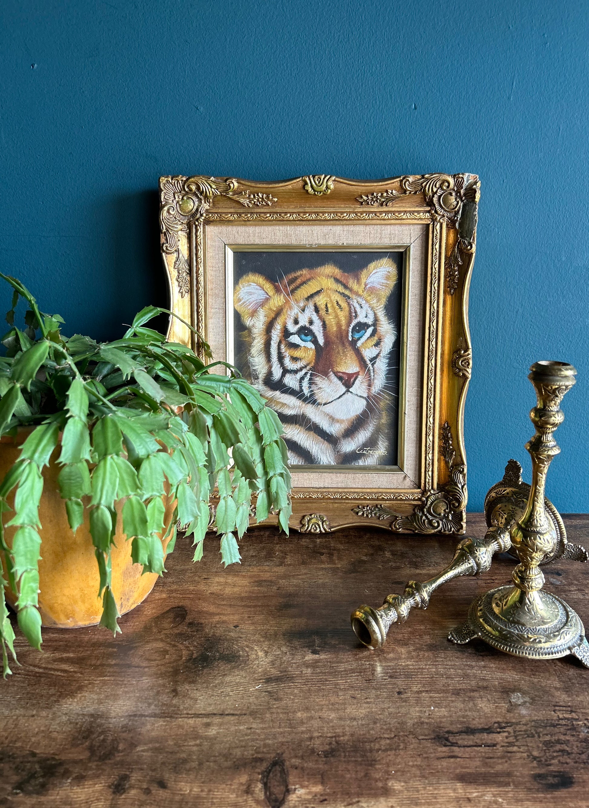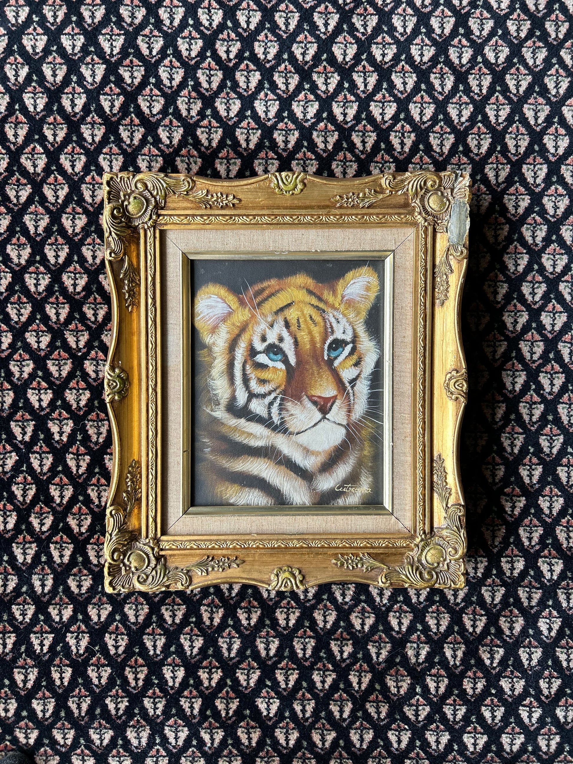 The original oil paining on canvas features a tiger cub, rich hues of brown and gold, and an ornate gold washed frame. Signed "Cutrona" and dated to the early 1980s, it is in lovely vintage condition with minor wear to one corner of the frame.