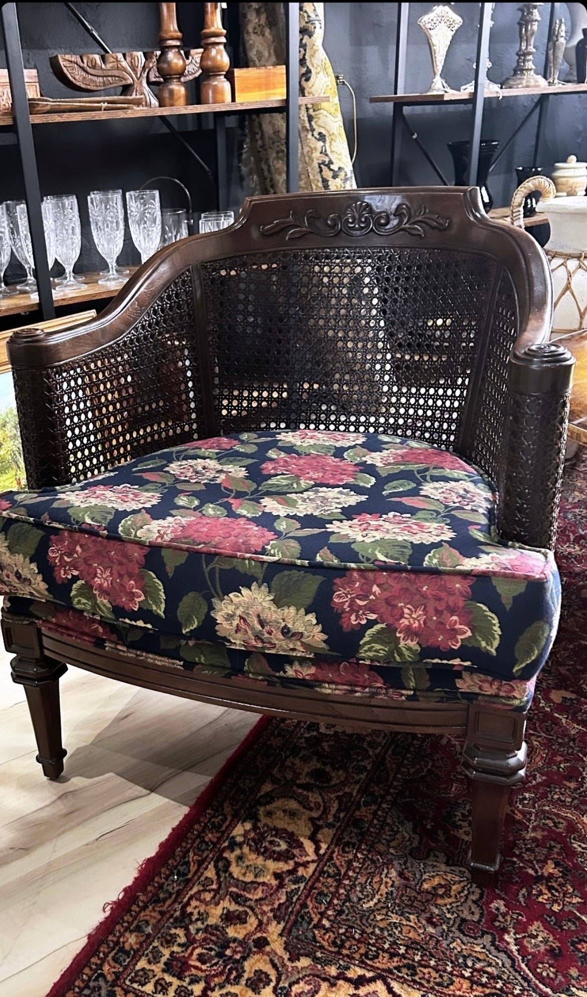 This vintage caned barrel chair has such an inviting, classic feel. The rich wood frame and intricate caning pair beautifully with the plush upholstered seat, making it as comfortable as it is stylish. Perfect for a reading nook, bedroom corner, or adding a bit of old-world charm to a living space.