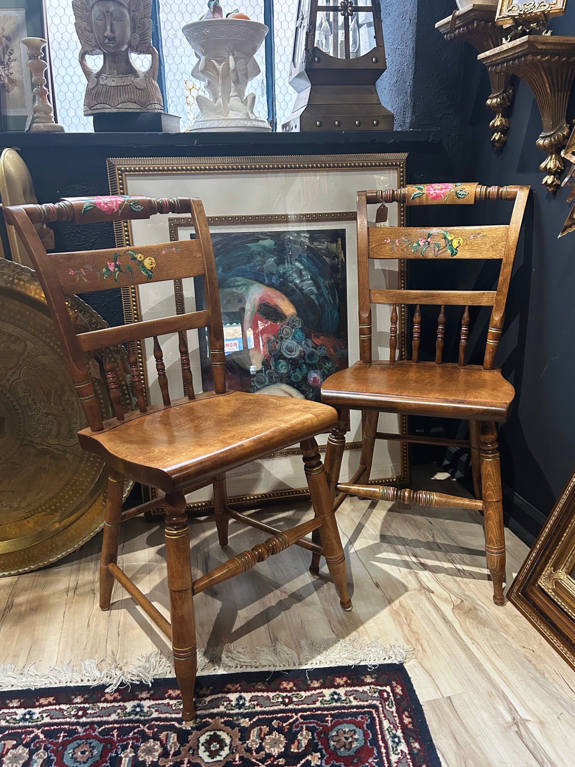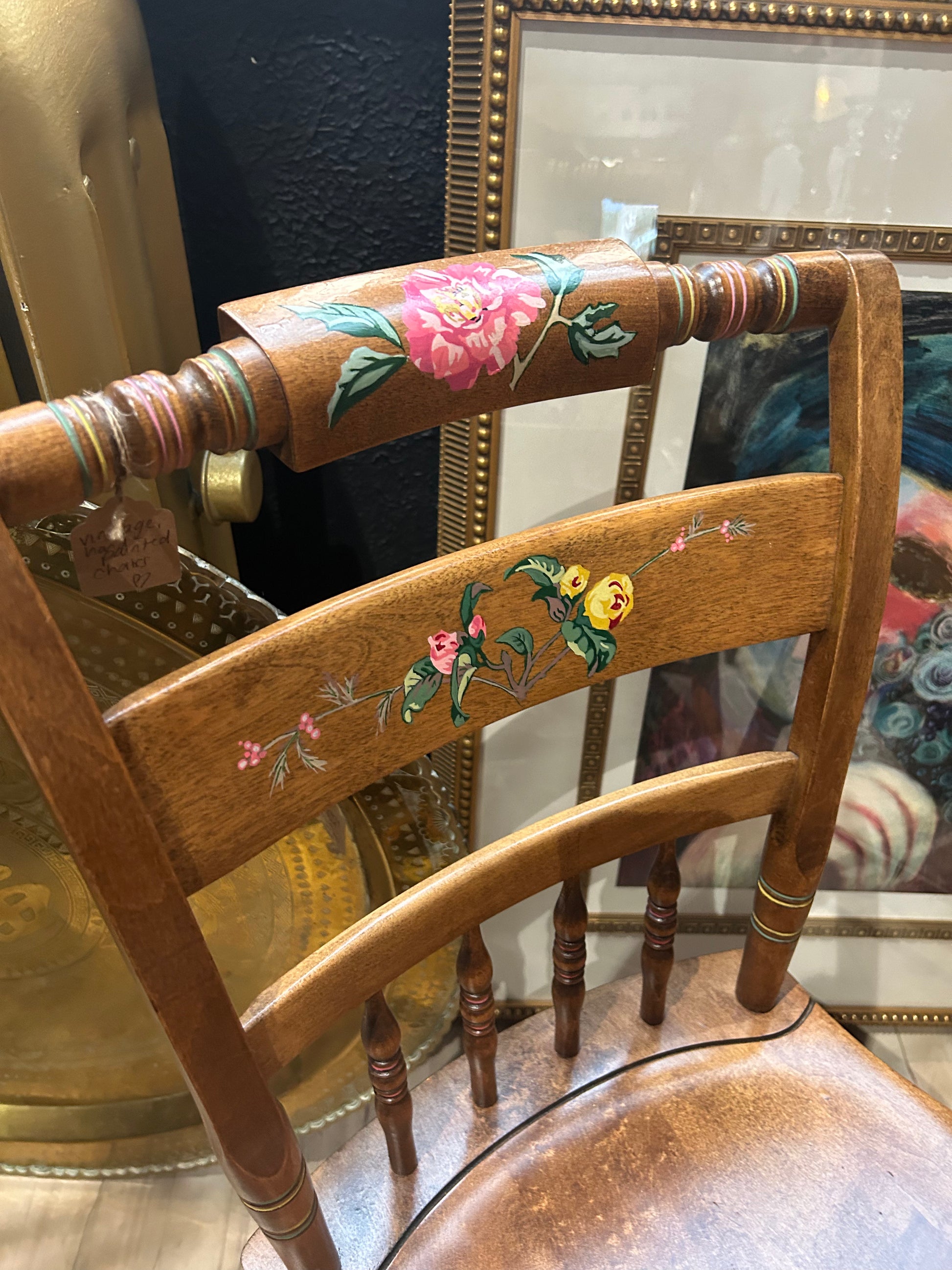 These vintage, hand-painted solid wood chairs offer a charming allusion to Hitchcock-style chairs. Absolutely lovely around a tea table; perfect for extra seating in a living room; or a nice sturdy office chair. Each comes with a custom pink and green striped seat cushion (with ties) if desired!