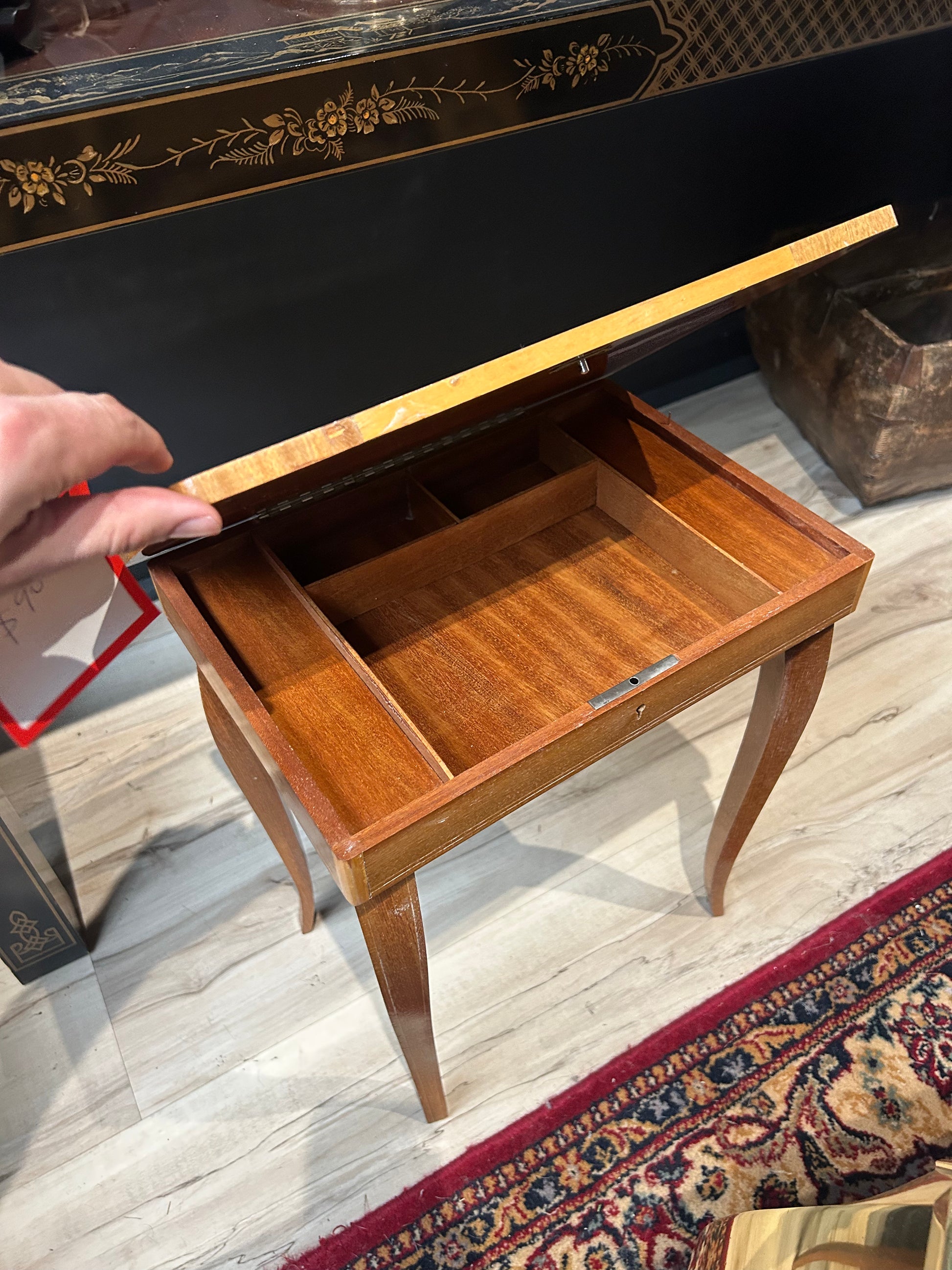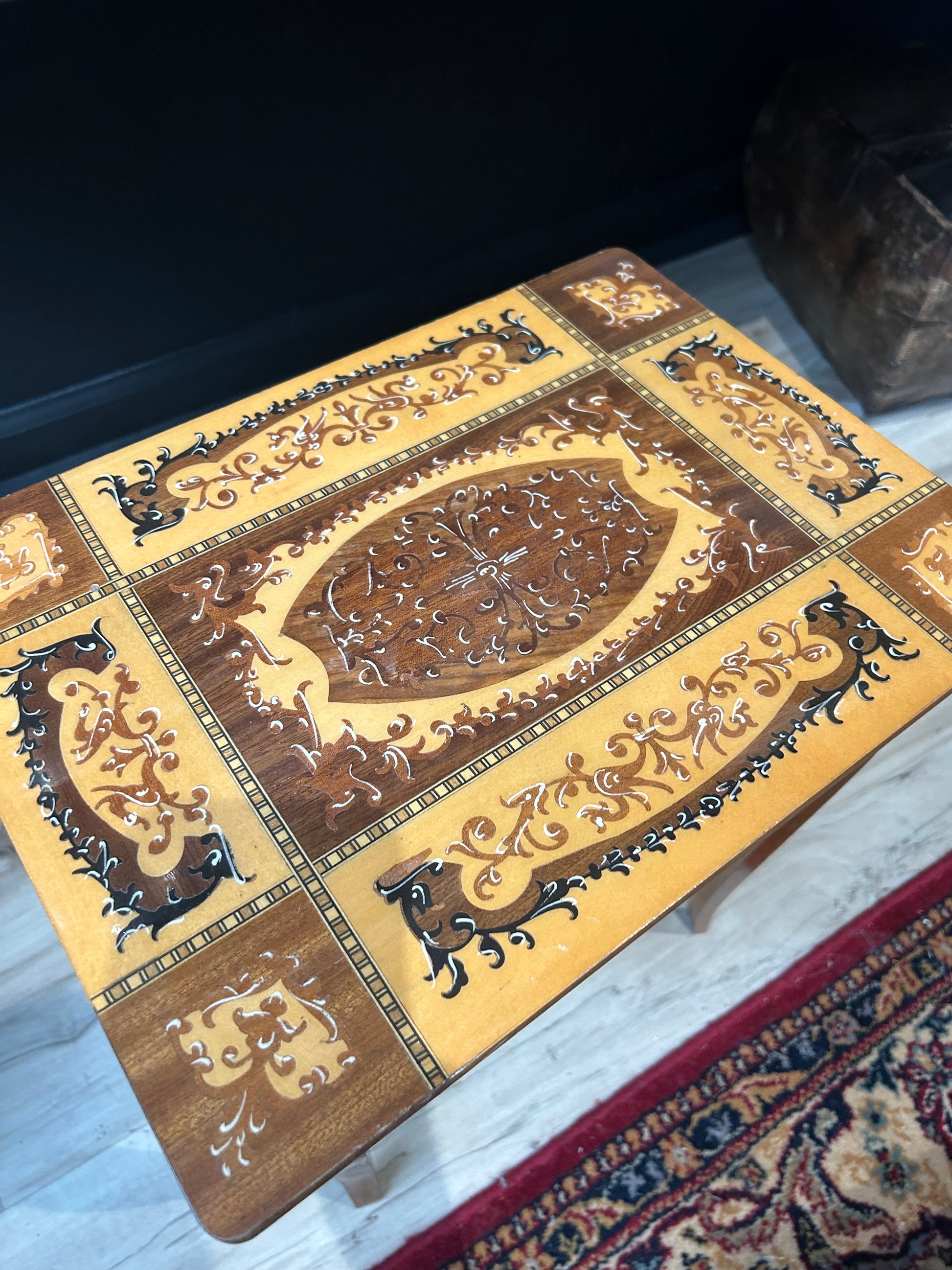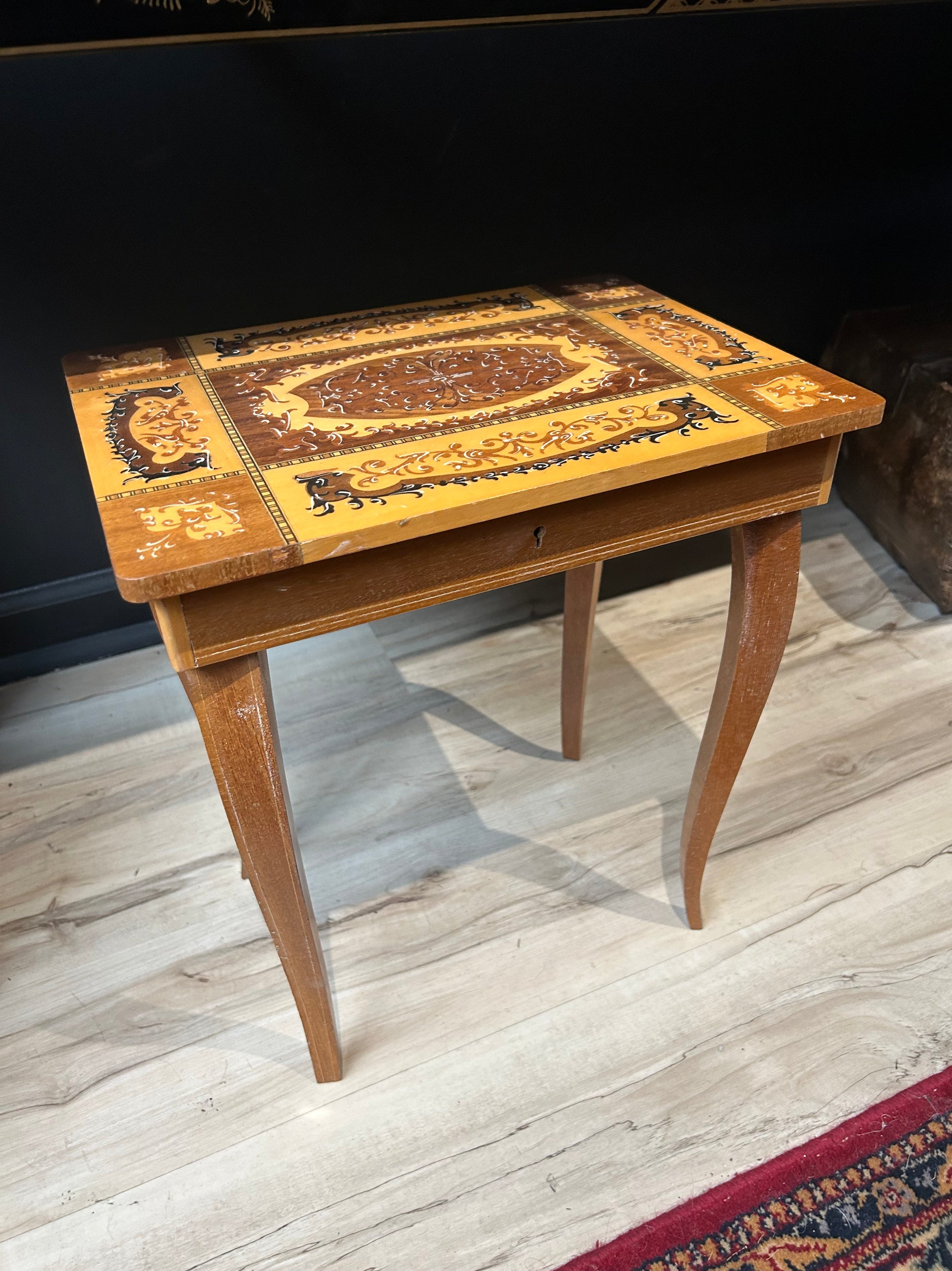 This vintage inlaid wood musical storage table is such a special piece, blending elegance with function. The intricate marquetry detailing and warm tones give it an old-world charm, while the hidden storage adds a touch of practicality. Perfect beside a reading chair or as a unique accent in a refined space.